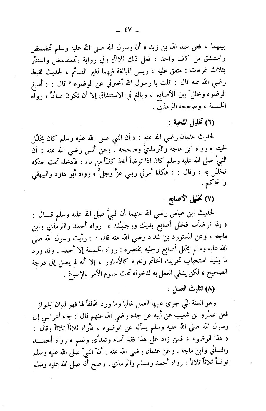 (7) تخليل الاصابع: لحديث ابن عباس رضي الله عنهما أن النبي صلى الله عليه وسلم قال: (إذا توضأت فخلل أصابع يديك ورجليك) رواه أحمد والترمذي وابن ماجه، وعن المستورد بن شداد رضي الله عنه قال: (رأيت رسول الله صلى