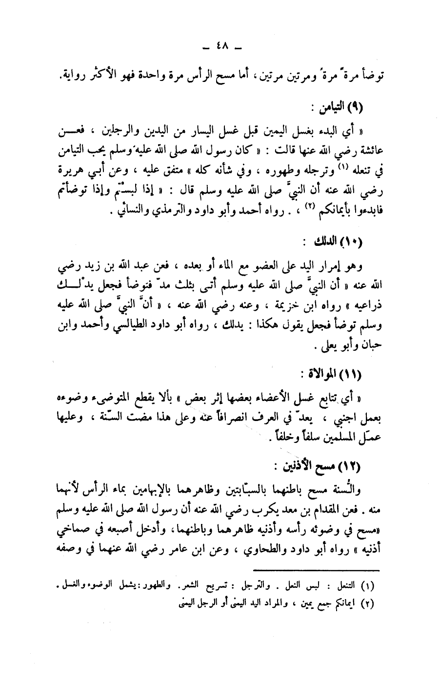 (9) التيامن: (أي البدء بغسل اليمين قبل غسل اليسار من اليدين والرجلين، فعن عائشة رضي الله عنها قالت: (كان رسول الله صلى الله عليه وسلم يحب التيامن في تنعله (1) وترجله وطهوره، وفي شأنه كله) متفق عليه، وعن أبي هريرة رضي الله عنه أن النبي صلى الله عليه وسلم قال: (إذا لبستم وإذا توضأتم فأبدءوا بأيمانكم (2) . رواه أحمد وأبو داود والترمذي والنسائي.