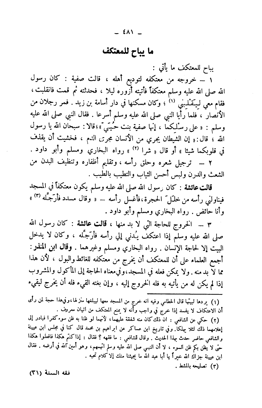 يباح للمعتكف ما يأتي: 1 - خروجه من معتكفه لتوديع أهله، قالت صفية، كان رسول الله صلى الله عليه وسلم معتكفا فأتيته أزوره ليلا، فحدثته ثم قمت فانقلبت، فقام معي ليقلبني (1) ، وكان مسكنها في دار أسامة بن زيد. فمر رجلان من الانصار، فلما رأيا النبي صلى الله عليه وسلم أسرعا. فقال النبي صلى الله عليه وسلم: " على رسلكما، إنها صفية بنت حيي "، قالا: سبحان الله يا رسول الله، قال: " إن الشيطان يجري من الانسان مرجى الدم، فخشيت أن يقذف في قلوبكما شيئا " أو قال " شرا (2) " رواه البخاري ومسلم وأبو داود.