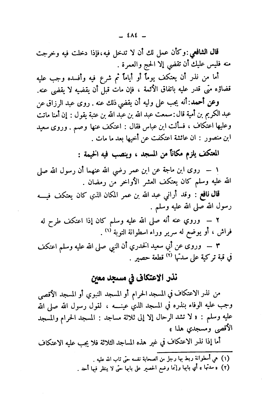 2 - وروي عنه أنه صلى الله عليه وسلم كان إذا اعتكف طرح له فراش، أو يوضع له سرير وراء اسطوانة التوبة (1) .