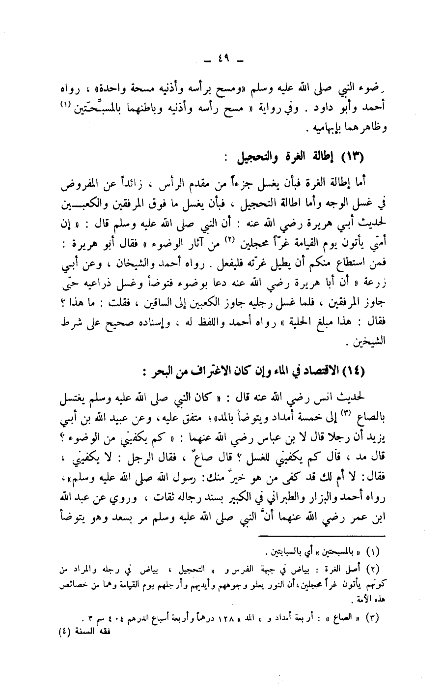 (14) الاقتصاد في الماء وإن كان الاغتراف من البحر: لحديث أنس رضي الله عنه قال: (كان النبي صلى الله عليه وسلم يغتسل بالصاع (3) إلى خمسة أمداد ويتوضأ بالمد) ، متفق عليه، وعن عبيد الله بن أبي يزيد أن رجلا قال لابن عباس رضي الله عنهما: (كم يكفيني من الوضوء؟ قال مد، قال كم يكفيني للغسل؟ قال صاع، فقال الرجل: لا يكفيني، فقال: لا أم لك قد كفى من هو خير منك: رسول الله صلى الله عليه وسلم) ، رواه أحمد والبزار والطبراني في الكبير بسند رجاله ثقات، وروي عن عبد الله ابن عمر رضي الله عنهما أن النبي صلى الله عليه وسلم مر بسعد وهو يتوضأ