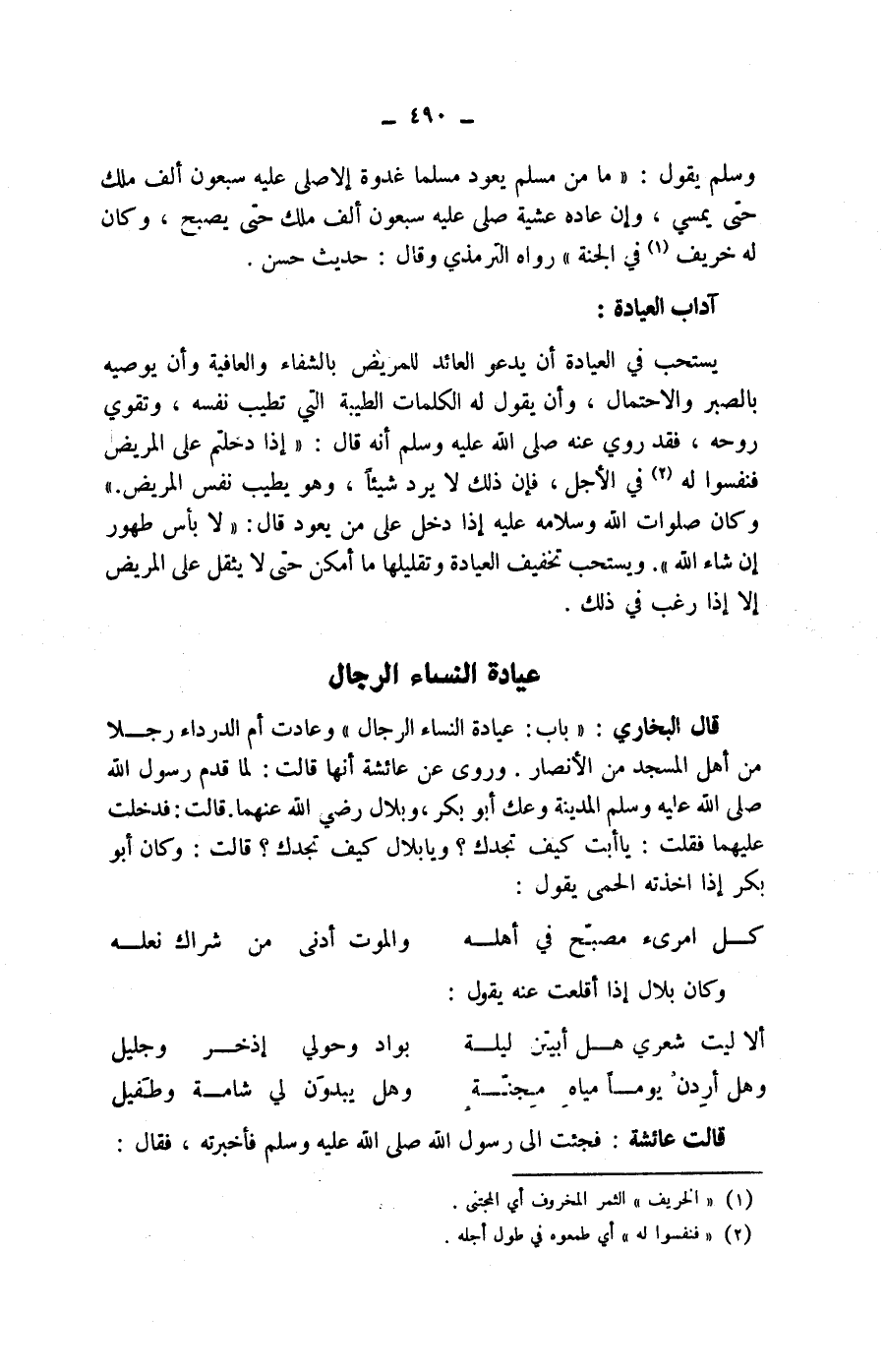وسلم يقول: " ما من مسلم يعود مسلما غدوة إلا صلى عليه سبعون ألف ملك حتى يمسي، وإن عاده عشية صلى عليه سبعون ألف ملك حتى يصبح، وكان له خريف (1) في الجنة " رواه الترمذي وقال: حديث حسن.