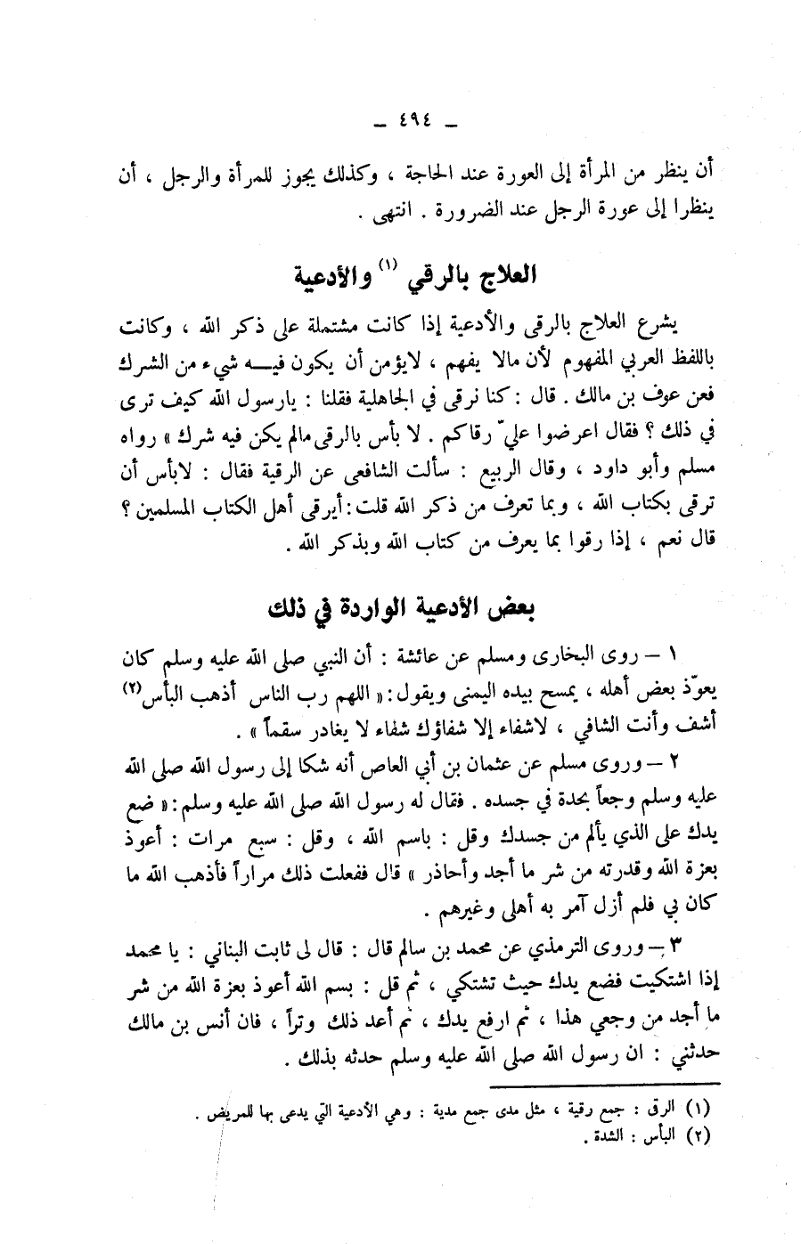 1 - روى البخاري ومسلم عن عائشة: أن النبي صلى الله عليه وسلم كان يعوذ بعض أهله، يمسح بيده اليمنى ويقول: " اللهم رب الناس أذهب البأس (2) أشف وأنت الشافي، لاشفاء إلا شفاؤك شفاء لا يغادر سقما ".