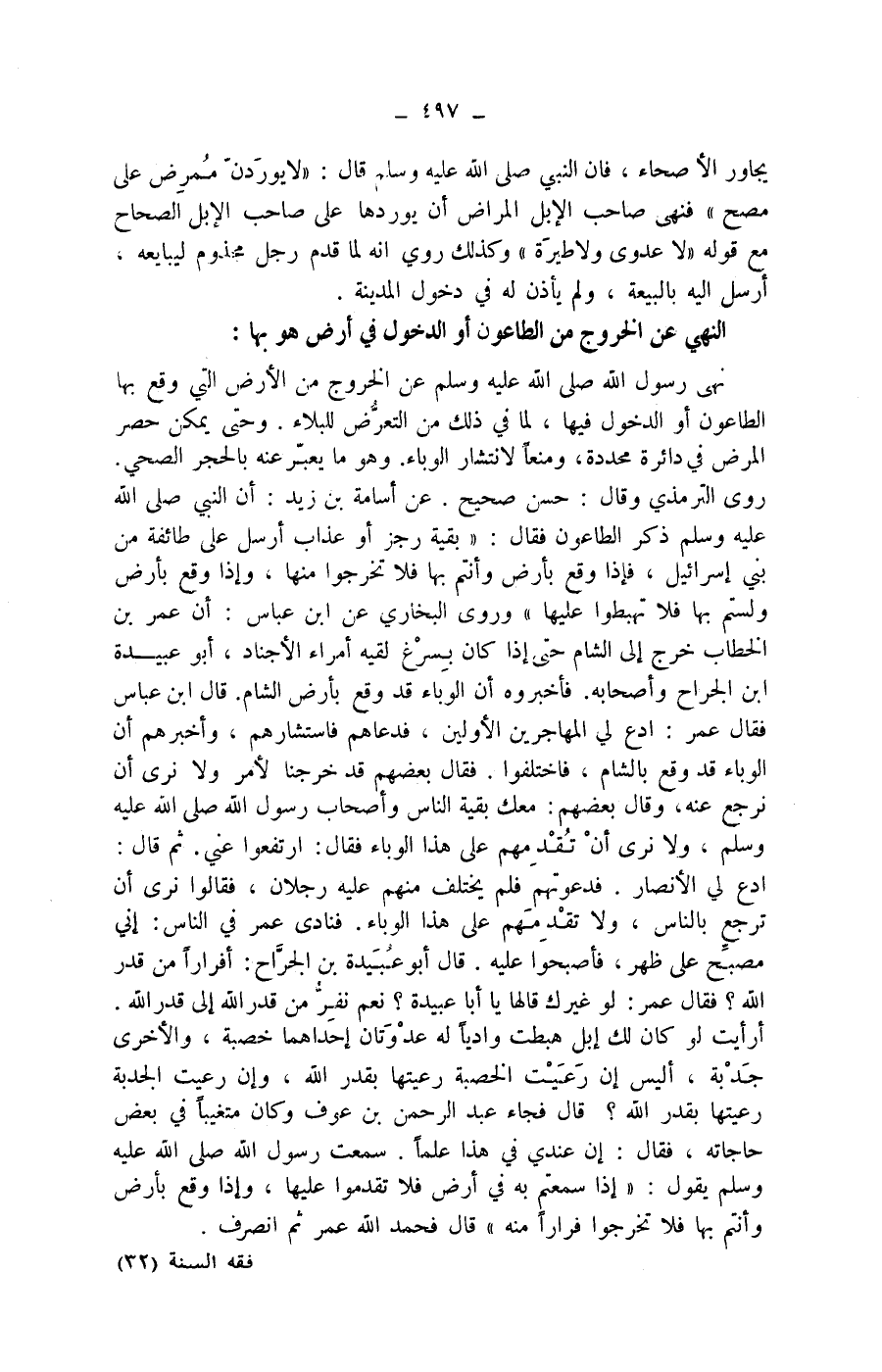 عن أسامة بن زيد: أن النبي صلى الله عليه وسلم ذكر الطاعون فقال: " بقية رجز أو عذاب أرسل على طائفة من بني إسرائيل، فإذا وقع بأرض وأنتم بها فلا تخرجوا منها، وإذا وقع بأرض ولستم بها فلا تهبطوا عليها " وروى البخاري عن ابن عباس: أن عمر بن الخطاب خرج إلى الشام حتى إذا كان بسرغ لقيه أمراء الاجناد، أبو عبيدة ابن الجراح وأصحابه.