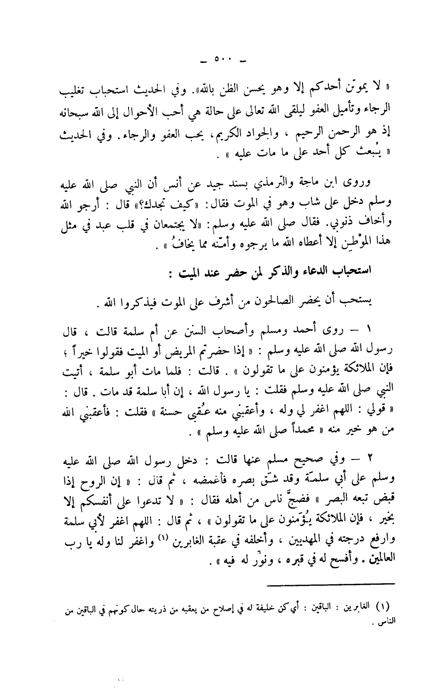 2 - وفي صحيح مسلم عنها قالت: دخل رسول الله صلى الله عليه وسلم على أبي سلمة وقد شق بصره فأغمضه، ثم قال: " إن الروح إذا قبض تبعه البصر " فضج ناس من أهله فقال: " لا تدعوا على أنفسكم إلا بخير، فإن الملائكة يؤمنون على ما تقولون "، ثم قال: " اللهم اغفر لابي سلمة وارفع درجته في المهديين، وأخلفه في عقبة الغابرين (1) واغفر لنا وله يا رب العالمين.