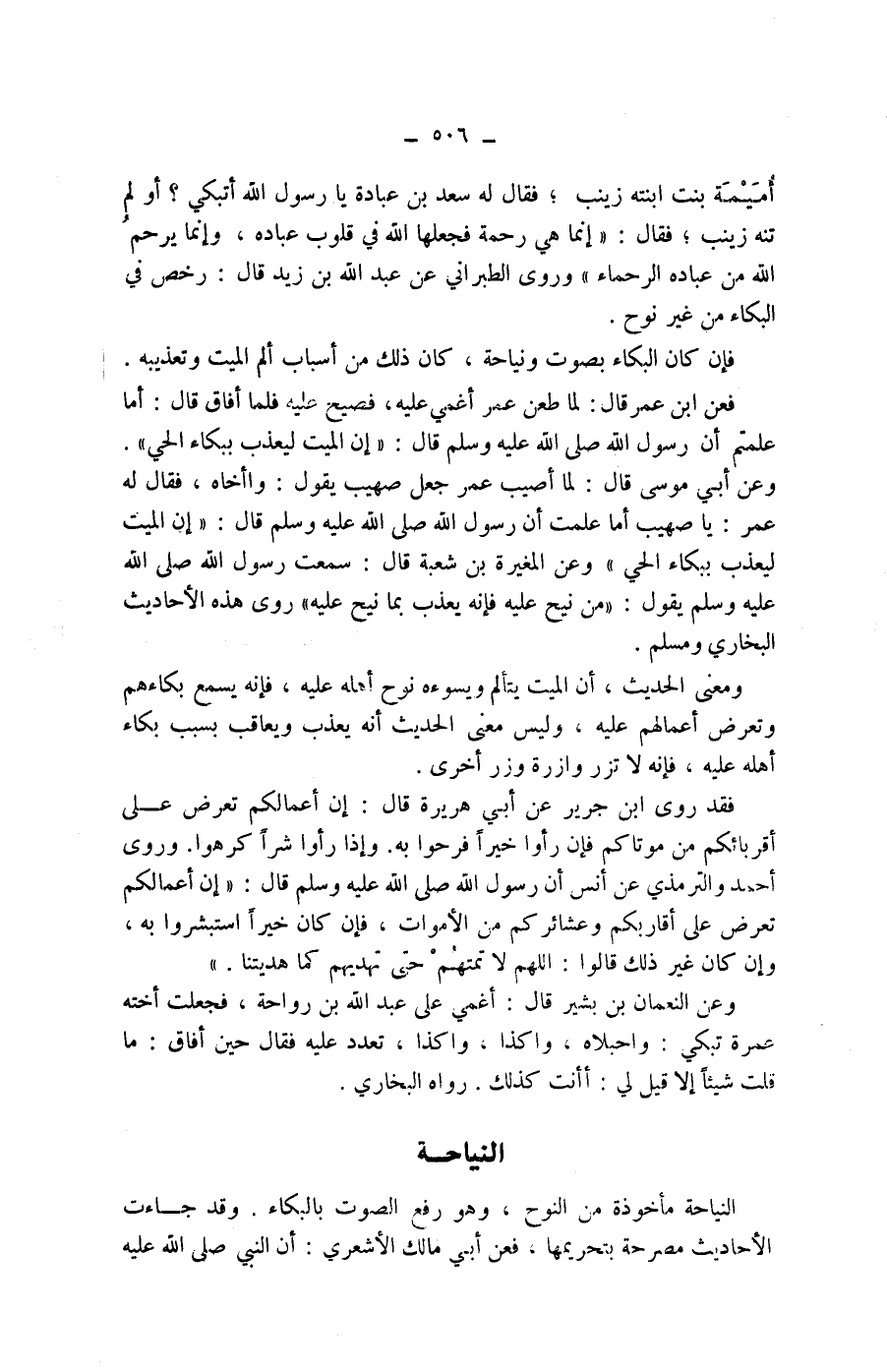 أميمة بنت ابنته زينب، فقال له سعد بن عبادة يا رسول الله أتبكي؟ أو لم تنه زينب، فقال: " إنما هي رحمة فجعلها الله في قلوب عباده، وإنما يرحم الله من عباده الرحماء " وروى الطبراني عن عبد الله بن زيد قال: رخص في البكاء من غير نوح.