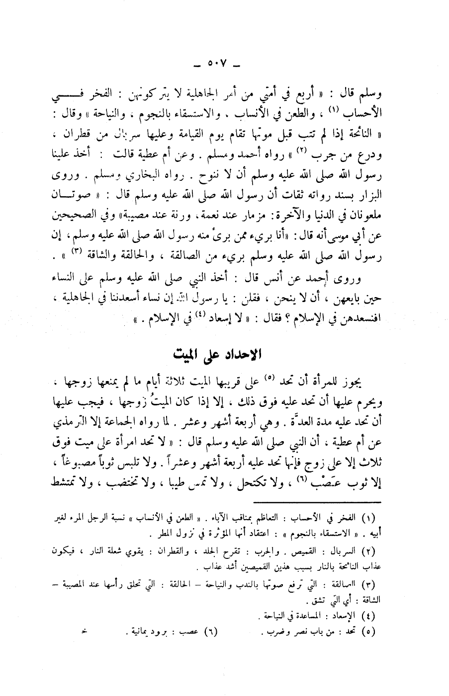 وسلم قال: " أربع في أمتي من أمر الجاهلية لا يتركونهن: الفخر في الاحساب (1) ، والطعن في الانساب، والاستسقاء بالنجوم، والنياحة " وقال: " النائحة إذا لم تتب قبل موتها تقام يوم القيامة وعليها سربال من قطران، ودرع من جرب (2) " رواه أحمد ومسلم.
