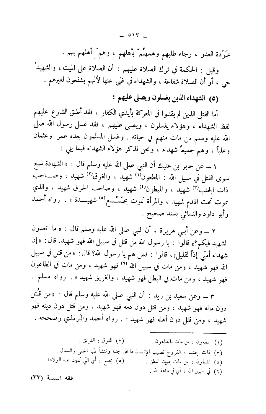 (5) الشهداء الذين يغسلون ويصلى عليهم: أما القتلى الذين لم يقتلوا في المعركة بأيدي الكفار، فقد أطلق الشارع عليهم لفظ الشهداء، وهؤلاء يغسلون، ويصلى عليهم، فقد غسل رسول الله صلى الله عليه وسلم من مات منهم في حياته.