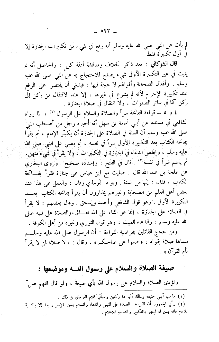 قال الشوكاني: بعد ذكر الخلاف ومناقشة أدلة كل: والحاصل أنه لم يثبت في غير التكبيرة الاولى شئ يصلح للاحتجاج به عن النبي صلى الله عليه وسلم. وأفعال الصحابة وأقوالهم لاحجة فيها، فينبغي أن يقتصر على الرفع عند تكبيرة الاحرام لانه لم يشرع في غيرها، إلا عند الانتقال من ركن إلى ركن كما في سائر الصلوات، ولا انتقال في صلاة الجنازة.
