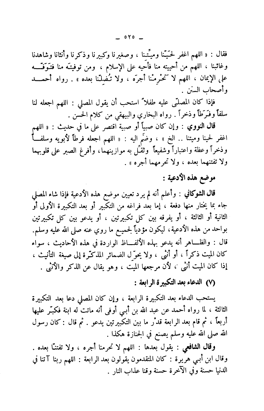 (7) الدعاء بعد التكبيرة الرابعة: يستحب الدعاء بعد التكبيرة الرابعة، وإن كان المصلي دعا بعد التكبيرة الثالثة، لما رواه أحمد عن عبد الله بن أبي أوفى أنه ماتت له ابنة فكبر عليها أربعا، ثم قام بعد الرابعة قدر ما بين التكبيرتين يدعو.
