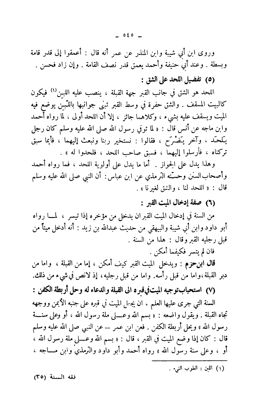 (6) صفة إدخال الميت القبر: من السنة في إدخال الميت القبران يدخل من مؤخره إذا تيسر، لما رواه أبو داود وابن أبي شيبة والبيهقي من حديث عبد الله بن زيد: أنه أدخل ميتا من قبل رجليه القبر وقال: هذا من السنة.