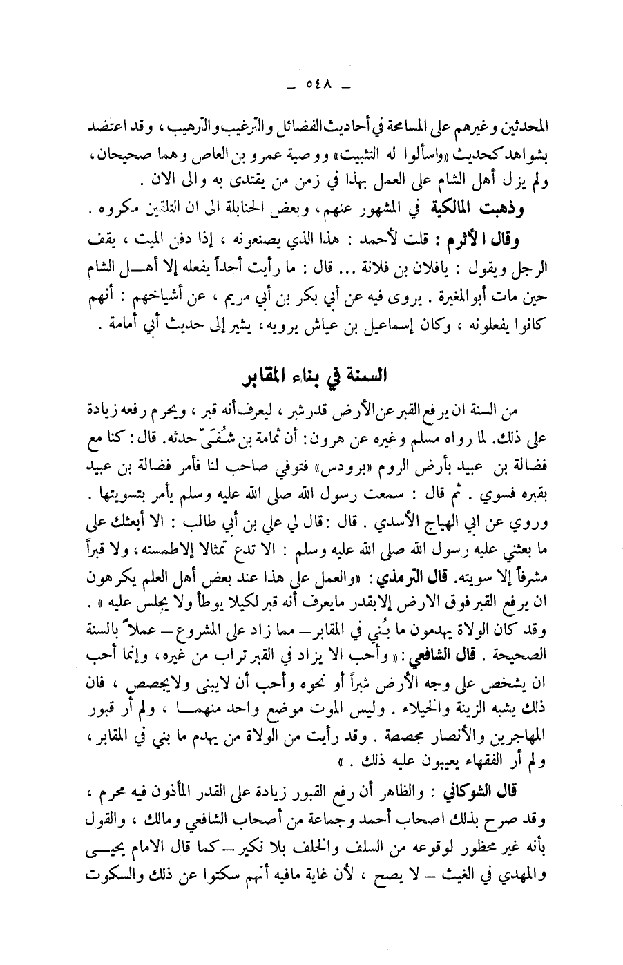 " قال الشوكاني: والظاهر أن رفع القبور زيادة على القدر المأذون فيه محرم، وقد صرح بذلك اصحاب أحمد وجماعة من أصحاب الشافعي ومالك، والقول بأنه غير محظور لوقوعه من السلف والخلف بلانكير - كما قال الامام يحيى والمهدي في الغيث - لا يصح، لان غاية ما فيه أنهم سكتوا عن ذلك والسكوت