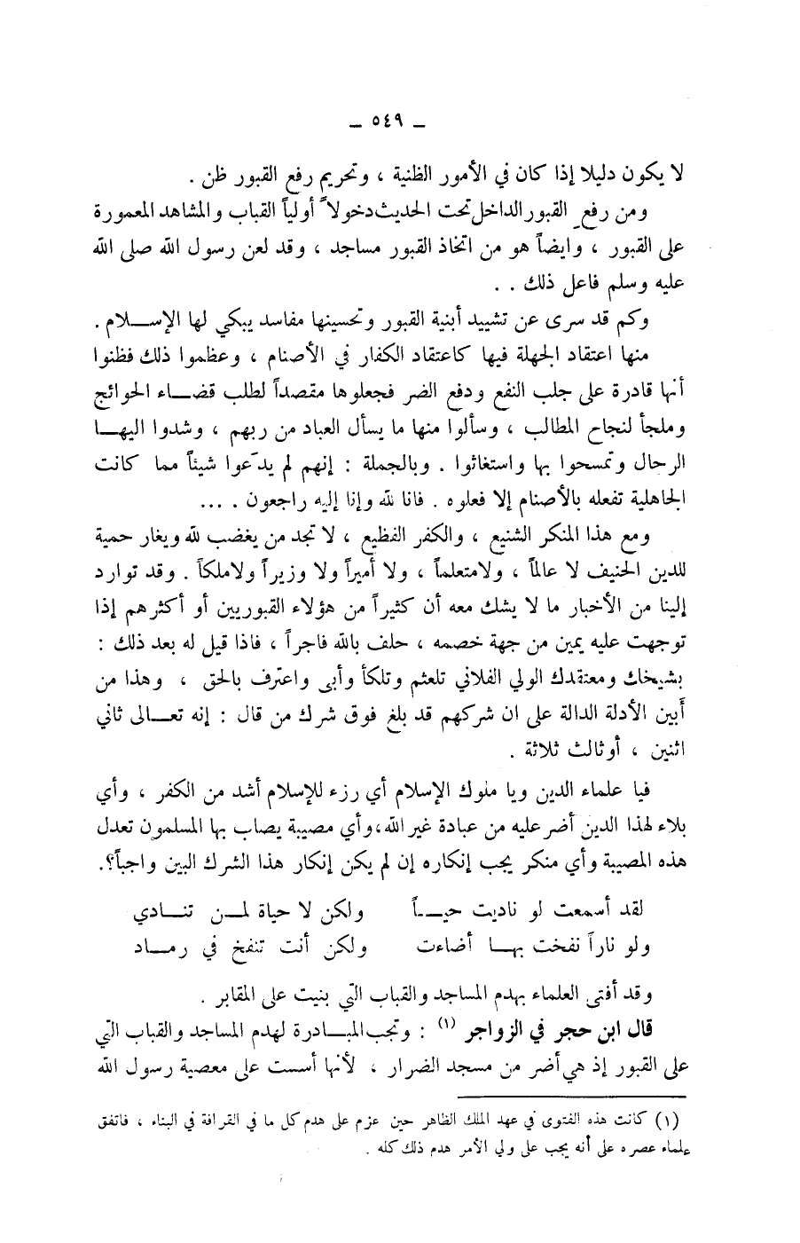 لقد أسمعت لو ناديت حيا ولكن لا حياة لمن تنادي ولو نارا نفخت بها أضاءت ولكن أنت تنفخ في رماد وقد أفتى العلماء بهدم المساجد والقباب التي بنيت على المقابر.