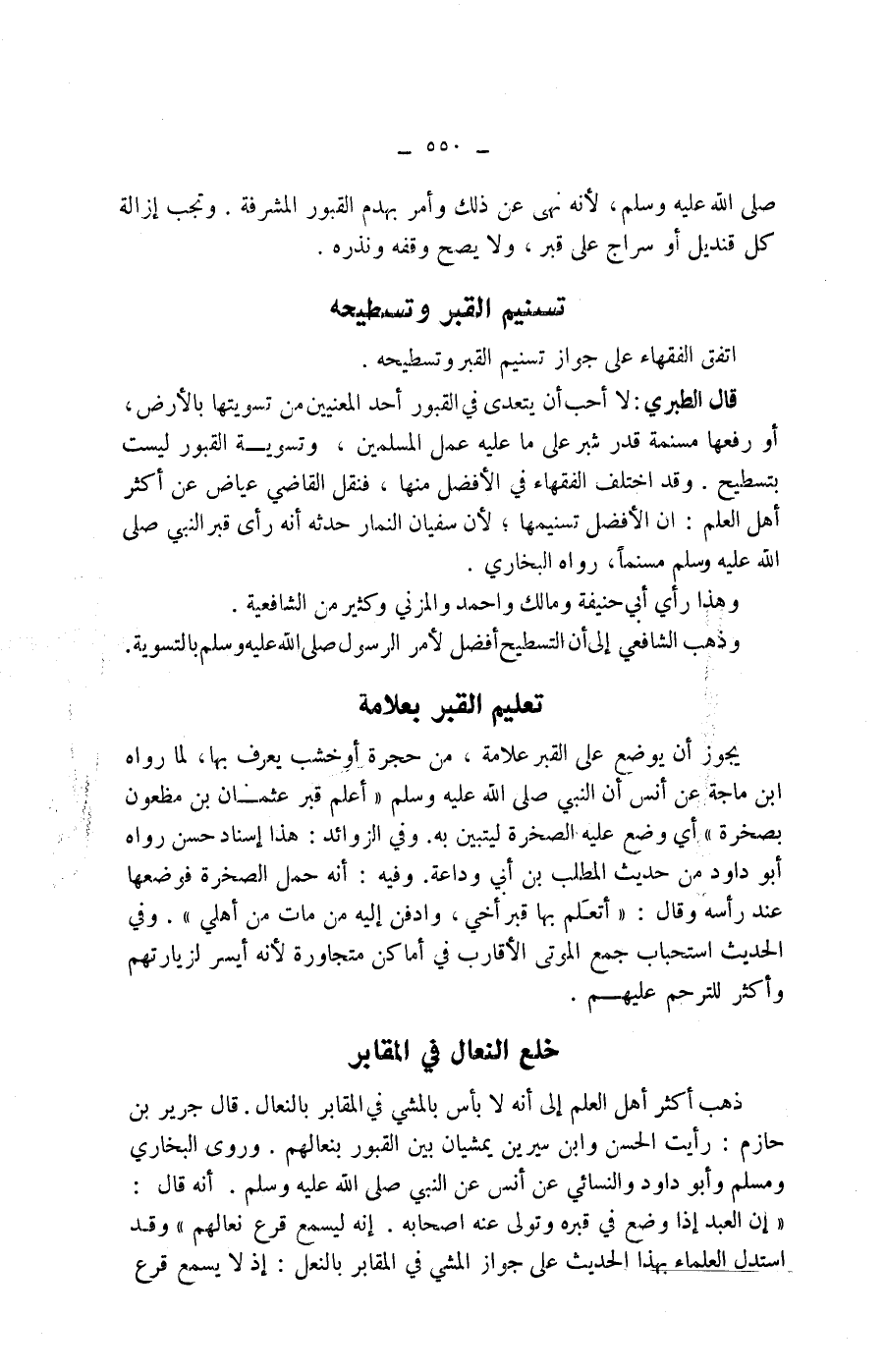 قال الطبري: لاأحب أن يتعدى في القبور أحد المعنيين من تسويتها بالارض، أو رفعها مسنمة قدر شبر على ما عليه عمل المسلمين، وتسوية القبور ليست بتسطيح.