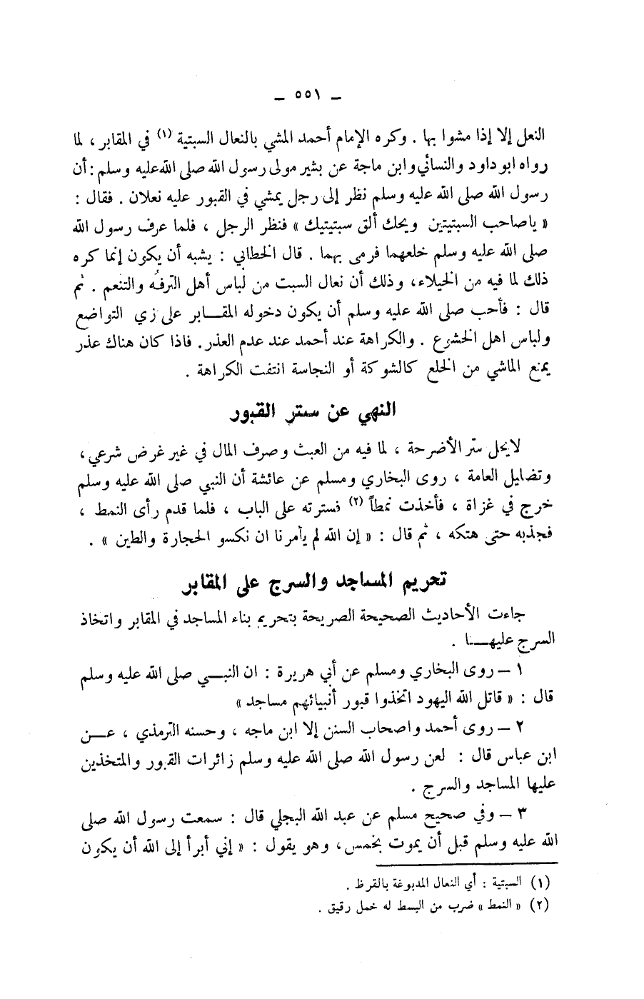 وكره الامام أحمد المشي بالنعال السبتية (1) في المقابر، لما رواه أبو داودو النسائي وابن ماجه عن بشير مولى رسول الله صلى الله عليه وسلم: أن رسول الله صلى الله عليه وسلم نظر إلى رجل يمشي في القبور عليه نعلان.
