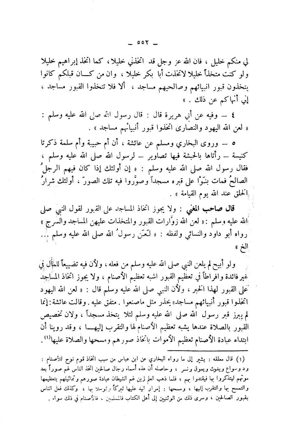 (1) قال معلقه: يشير إلى ما رواه البخاري عن ابن عباس من سبب اتخاذ قوم نوح للاصنام: ود وسواع ويغوث ويعوق ونسر، وحاصله أن هذه أسماء رجال صالحين اتخذ الناس لهم صورا بعد موتهم ليتذكروا بها فيقتدوابهم، فلما ذهب العلم زين لهم الشيطان عبادة صورهم وتماثيلهم بتعظيمها والتمسح بها والتقرب إليها، ومسحها: إمرار اليد عليها تبركا وتوسلا بها، وكذلك فعل الناس بقبور الصالحين، وسرى ذلك من الوثنيين إلى أهل الكتاب فالمسلمين، فالاصنام في ذلك سواء.