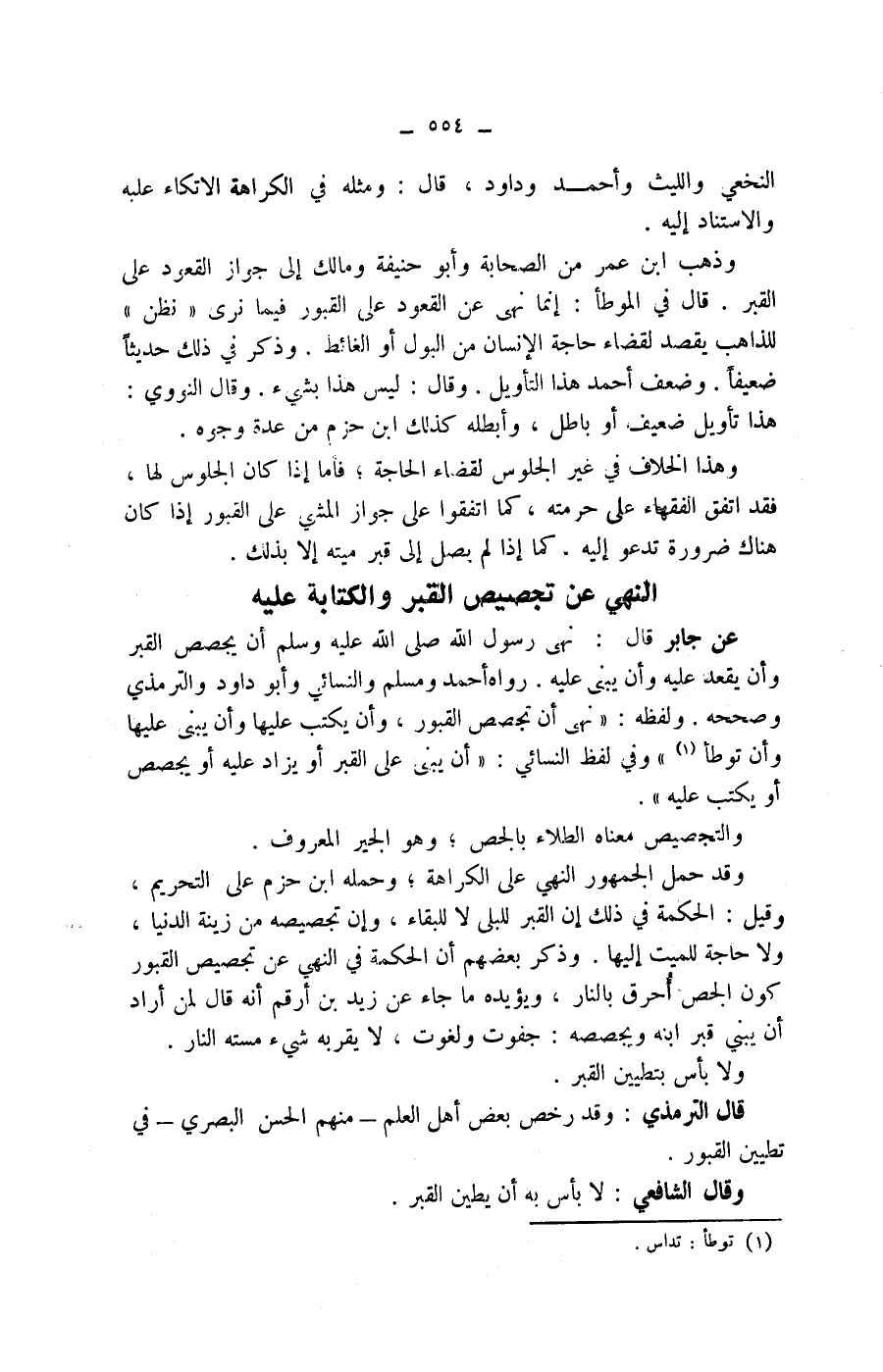 ولفظه: " نهى أن تجصص القبور، وأن يكتب عليها وأن يبني عليها وأن توطأ (1) " وفي لفظ النسائي: " أن يبني على القبر أو يزاد عليه أو يجصص أو يكتب عليه ".