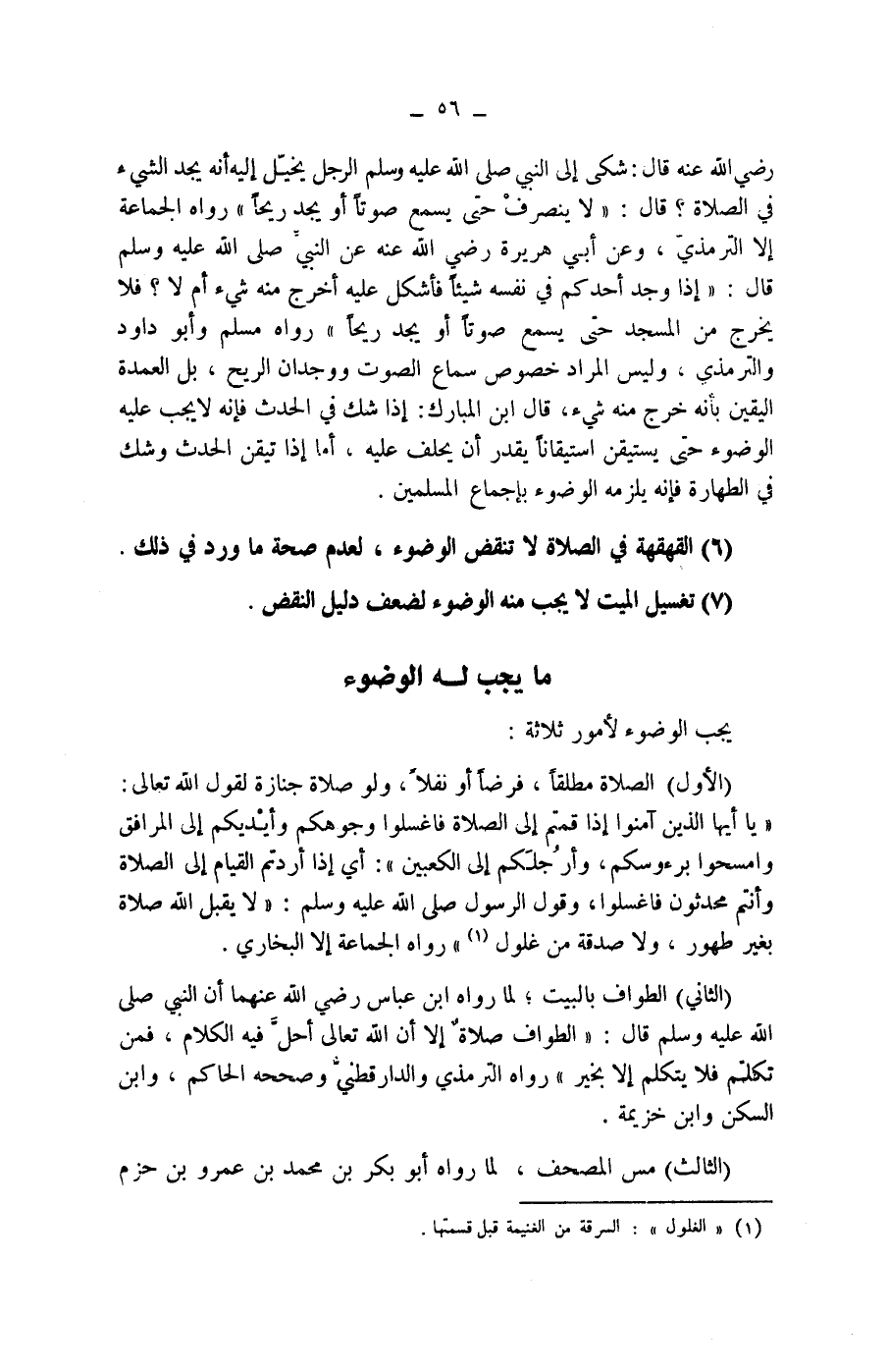 رضي الله عنه قال: شكى إلى النبي صلى الله عليه وسلم الرجل يخيل إليه أنه يجد الشئ في الصلاة؟ قال: (لا ينصرف حتى يسمع صوتا أو يجد ريحا) رواه الجماعة إلا الترمذي، وعن أبي هريرة رضي الله عنه عن النبي صلى الله عليه وسلم قال: (إذا وجد أحدكم في نفسه شيئا فأشكل عليه أخرج منه شئ أم لا؟ فلا يخرج من المسجد حتى يسمع صوتا أو يجد ريحا) رواه مسلم وأبو داود والترمذي، وليس المراد خصوص سماع الصوت ووجدان الريح، بل العمدة اليقين بأنه خرج منه شئ، قال ابن المبارك: إذا شك في الحدث فإنه لا يجب عليه الوضوء حتى يستيقن استيقانا يقدر أن يحلف عليه، أما إذا تيقن الحدث وشك في الطهارة فإنه يلزمه الوضوء بإجماع المسلمين.
