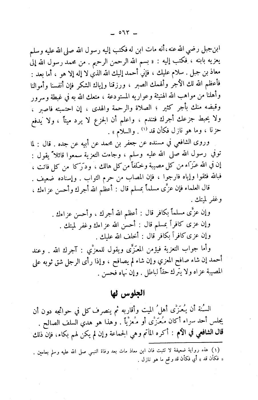 ابن جبل رضي الله عنه، أنه مات ابن له فكتب إليه رسول الله صلى الله عليه وسلم يعزيه بابنه، فكتب إليه: " بسم الله الرحمن الرحيم.