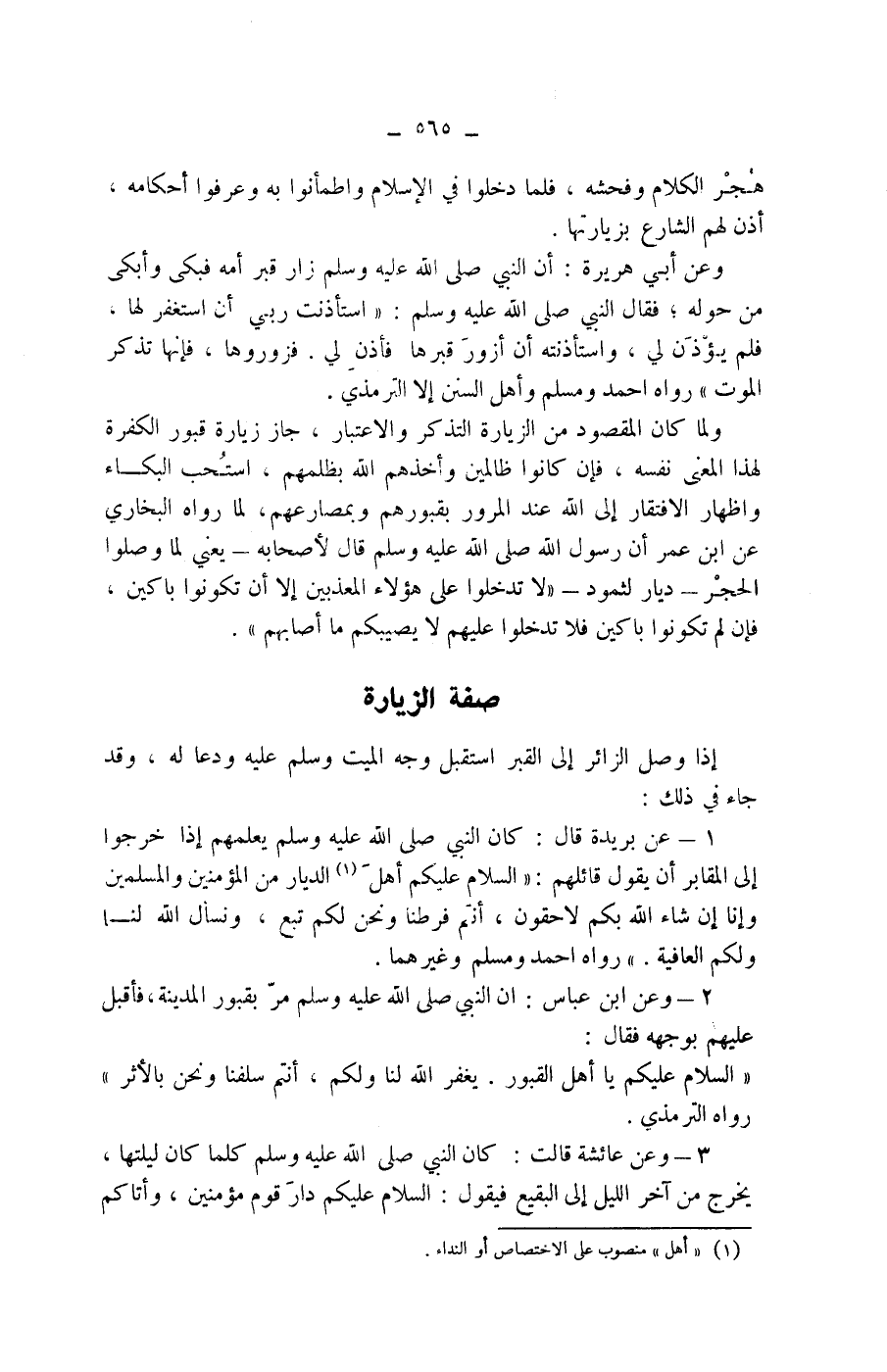 هجر الكلام وفحشه، فلما دخلوا في الاسلام واطمأنوا به وعرفوا أحكامه، أذن لهم الشارع بزيارتها: وعن أبي هريرة: أن النبي صلى الله عليه وسلم زار قبر أمه فبكى وأبكى من حوله، فقال النبي صلى الله عليه وسلم: " استأذنت ربي أن استغفر لها، فلم يؤذن لي، واستأذنته أن أزور قبرها فأذن لي. فزوروها، فإنها تذكر الموت " رواه احمد ومسلم وأهل السنن إلا الترمذي.