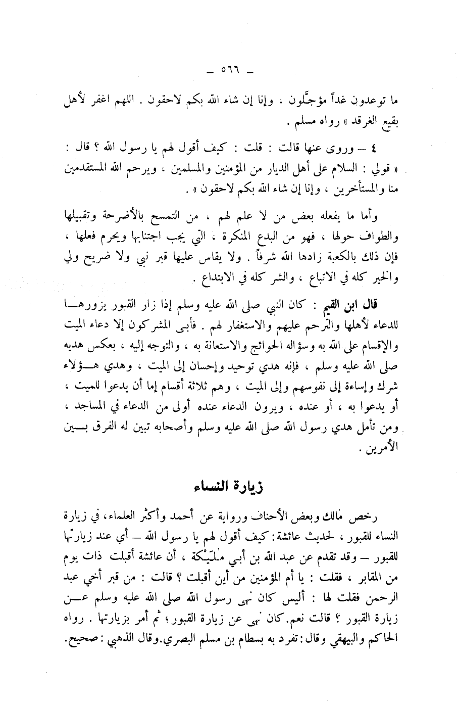 رخص مالك وبعض الاحناف ورواية عن أحمد وأكثر العلماء، في زيارة النساء للقبور، لحديث عائشة: كيف أقول لهم يارسول الله - أي عند زيارتها للقبور -.