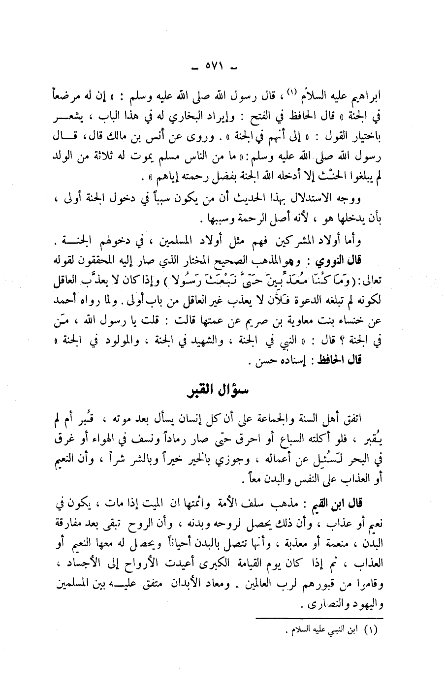 قال ابن القيم: مذهب سلف الامة وائمتها ان الميت إذا مات، يكون في نعيم أو عذاب، وأن ذلك يحصل لروحه وبدنه، وأن الروح تبقى بعد مفارقة البدن، منعمة أو معذبة، وأنها تتصل بالبدن أحيانا ويحصل له معها النعيم أو العذاب، ثم إذا كان يوم القيامة الكبرى أعيدت الارواح إلى الاجساد، وقاموا من قبورهم لرب العالمين.