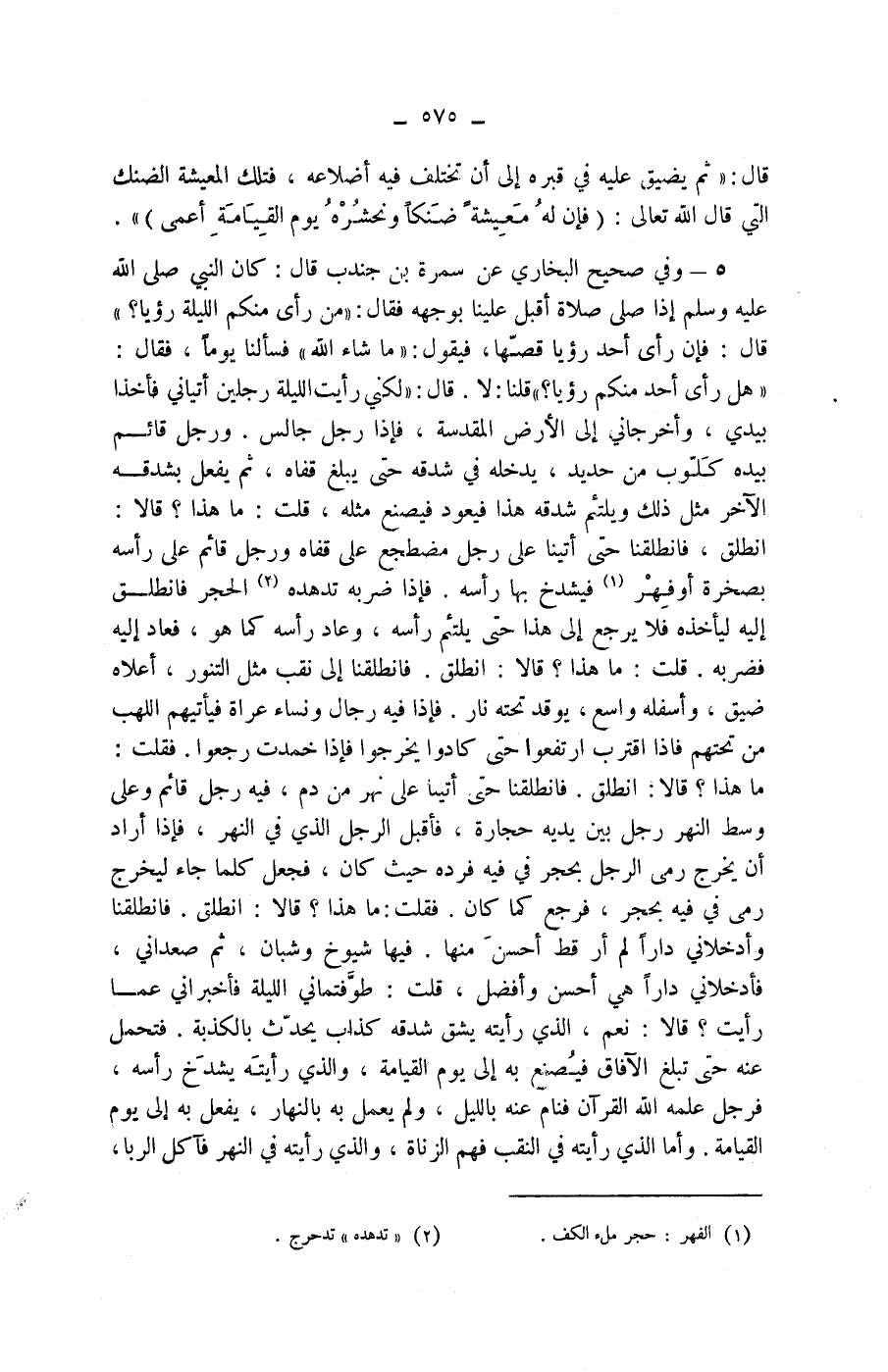 فإذا فيه رجال ونساء عراة فيأتيهم اللهب من تحتهم فإذا اقترب ارتفعوا حتى كادوا يخرجوا فإذا خمدت رجعوا. فقلت: ماهذا؟ قالا: انطلق. فانطلقنا حتى أتينا على نهر من دم، فيه رجل قائم وعلى وسط النهر رجل بين يديه حجارة، فأقبل الرجل الذي في النهر، فإذا أراد أن يخرج رمى الرجل بحجر في فيه فرده حيث كان، فجعل كلما جاء ليخرج رمى في فيه بحجر، فرجع كما كان. فقلت: ما هذا؟ قالا: انطلق. فانطلقنا وأدخلاني دارا لم أر قط أحسن منها. فيها شيوخ وشبان، ثم صعداني، فأدخلاني دارا هي أحسن وأفضل، قلت: طوفتماني الليلة فأخبراني عما رأيت؟ قالا: نعم، الذي رأيته يشق شدقه كذاب يحدث بالكذبة. فتحمل عنه حتى تبلغ الآفاق فيصنع به إلى يوم القيامة، والذي رأيته يشدخ رأسه، فرجل علمه الله القرآن فنام عنه بالليل، ولم يعمل به بالنهار، يفعل به إلى يوم القيامة.