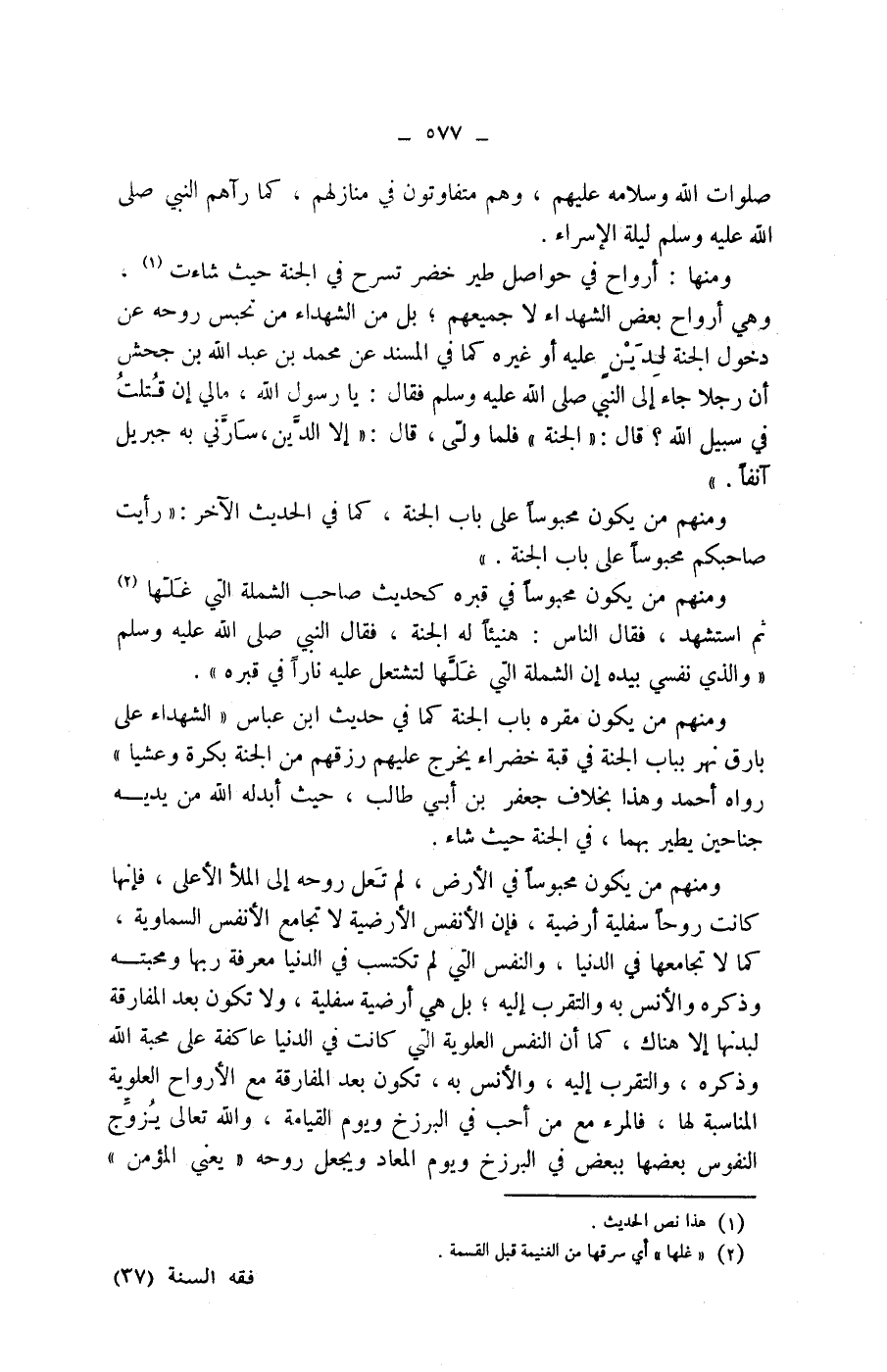 وهي أرواح بعض الشهداء لاجميعهم، بل من الشهداء من تحبس روحه عن دخول الجنة لدين عليه أو غيره كما في المسند عن محمد بن عبد الله بن جحش أن رجلا جاء إلى النبي صلى الله عليه وسلم فقال: يارسول الله، مالي إن قتلت في سبيل الله؟ قال: " الجنة " فلما ولى، قال: " إلا الدين، سارني به جبريل آنفا.