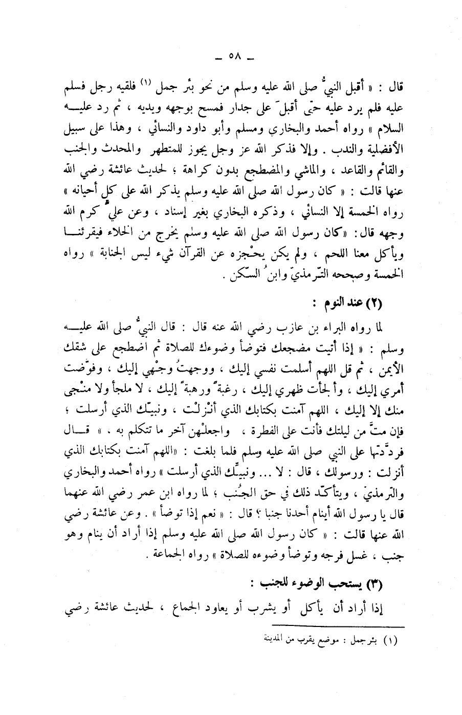 (2) عند النوم: لما رواه البراء بن عازب رضي الله عنه قال: قال النبي صلى الله عليه وسلم: (إذا أتيت مضجعك فتوضأ وضوءك للصلاة ثم اضطجع على شقك الايمن، ثم قل اللهم أسلمت نفسي إليك، ووجهت وجهي إليك، وفوضت أمري إليك، وألجأت ظهري إليك، رغبة ورهبة إليك، لا ملجأ ولا منجى منك إلا إليك، اللهم آمنت بكتابك الذي أنزلت، ونبيك الذي أرسلت، فإن مت من ليلتك فأنت على الفطرة، واجعلهن آخر ما تتكلم به،) قال فرددتها على النبي صلى الله عليه وسلم فلما بلغت: (اللهم آمنت بكتابك الذي أنزلت: ورسولت، قال: لا ... ونبيك الذي أرسلت) رواه أحمد والبخاري والترمذي، ويتأكد ذلك في حق الجنب، لما رواه ابن عمر رضي الله عنهما