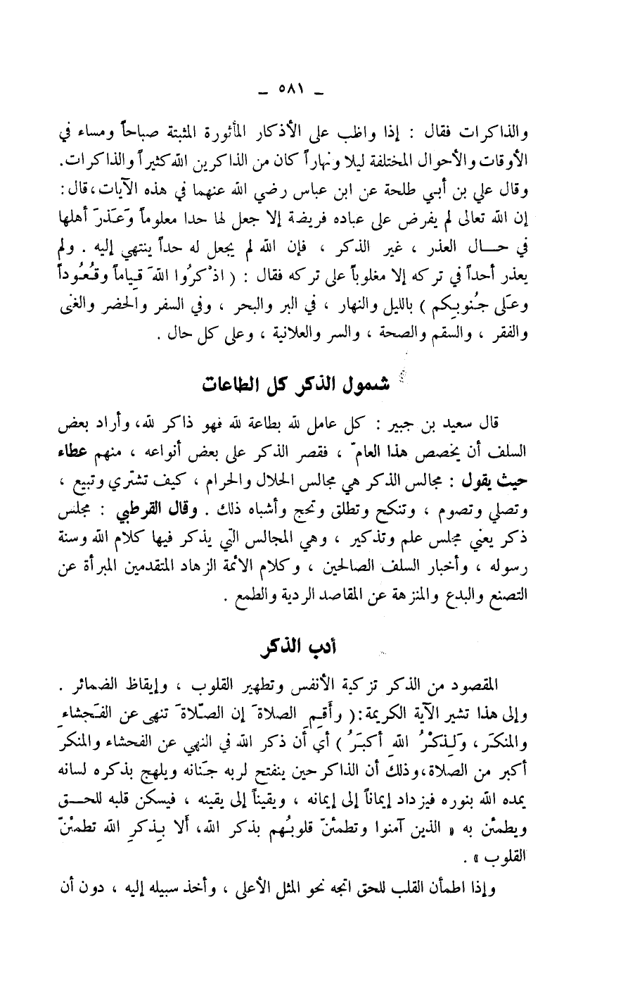 شمول الذكر كل الطاعات قال سعيد بن جبير: كل عامل لله بطاعة لله فهو ذاكر لله، وأراد بعض السلف أن يخصص هذا العام، فقصر الذكر على بعض أنواعه، منهم عطاء حيث يقول: مجالس الذكر هي مجالس الحلال والحرام، كيف تشتري وتبيع، وتصلي وتصوم، وتنكح وتطلق وتحج وأشباه ذلك.