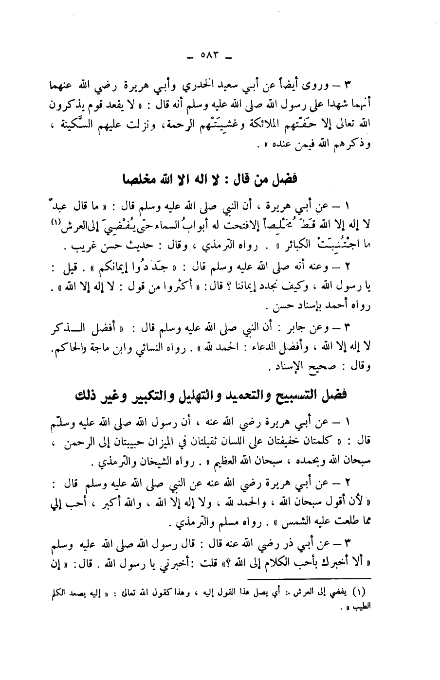 فضل من قال: لا اله الا الله مخلصا 1 - عن أبي هريرة، أن النبي صلى الله عليه وسلم قال: " ما قال عبد لا إله إلا الله قط مخلصا إلا فتحت له أبواب السماء حتى يفضي إلى العرش (1) ما اجتنبت الكبائر ".
