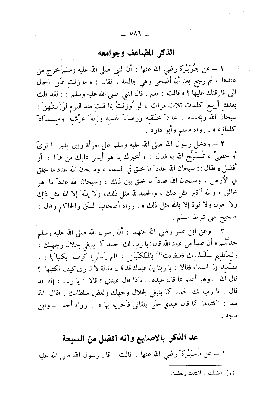 عد الذكر بالاصابع وأنه أفضل من السبحة 1 - عن بسيرة رضي الله عنها، قالت: قال رسول الله صلى الله عليه