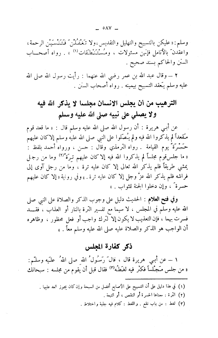 " وفي فتح العلام: الحديث دليل على وجوب الذكر والصلاة على النبي صلى الله عليه وسلم في المجلس، لاسيما مع تفسير الترة بالنار أو العذاب، فقد فسرت بهما، فإن التعذيب لا يكون إلا لترك واجب أو فعل محظور، وظاهره أن الواجب هو الذكر والصلاة عليه صلى الله عليه وسلم معا.