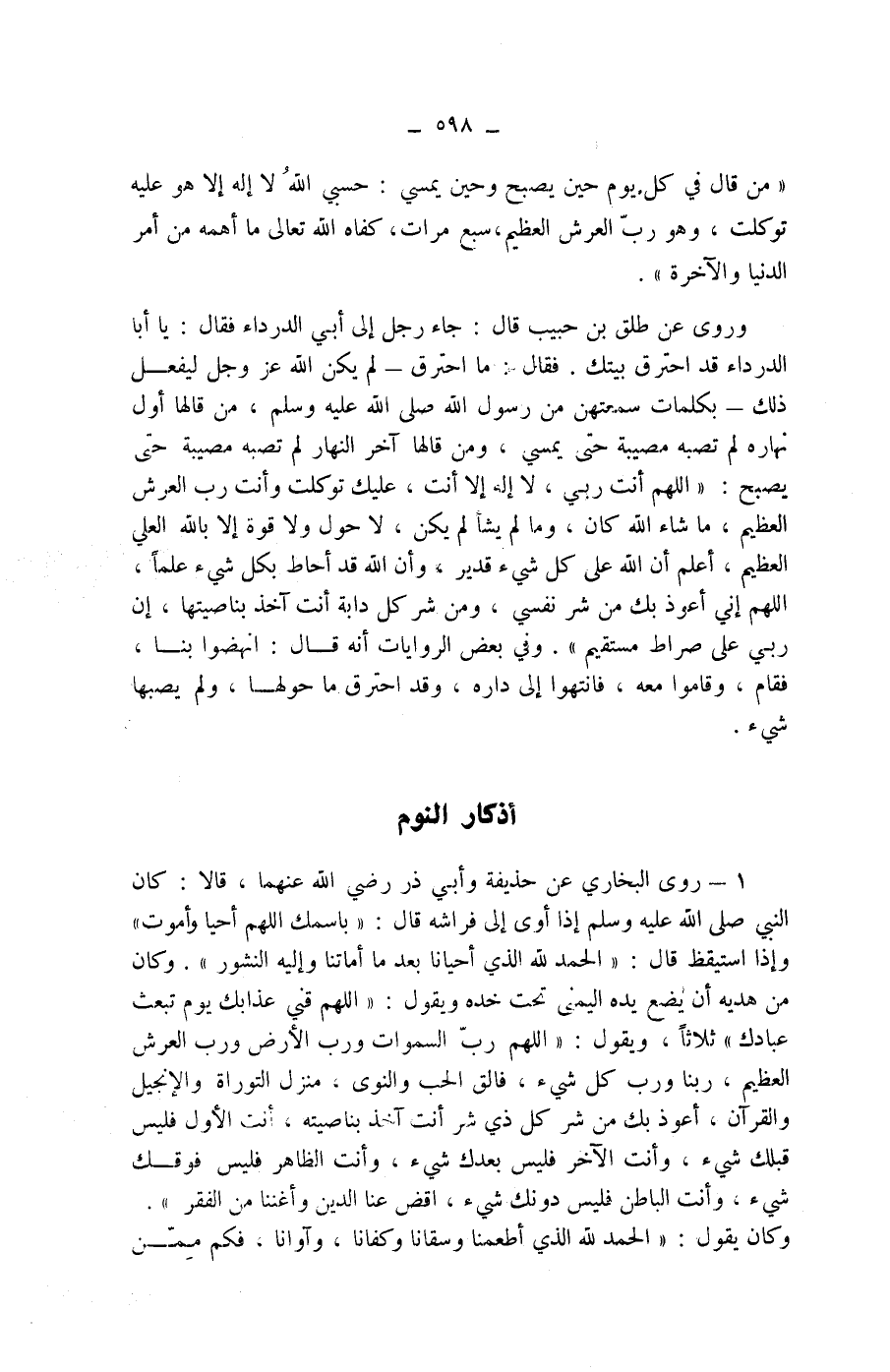 فقال: ما احترق - لم يكن الله عز وجل ليفعل ذلك - بكلمات سمعتهن من رسول الله صلى الله عليه وسلم، من قالها أول نهاره لم تصبه مصيبة حتى يمسي، ومن قالها آخر النهار لم تصبه مصيبة حتى يصبح: " اللهم أنت ربي، لا إله إلا أنت، عليك توكلت وأنت رب العرش العظيم، ما شاء الله كان، وما لم يشأ لم يكن، لا حول ولا قوة إلا بالله العلي العظيم، أعلم أن الله على كل شئ قدير، وأن الله قد أحاط بكل شئ علما، اللهم إني أعوذ بك من شر نفسي، ومن شر كل دابة أنت آخذ بناصيتها، إن ربي على صراط مستقيم ".