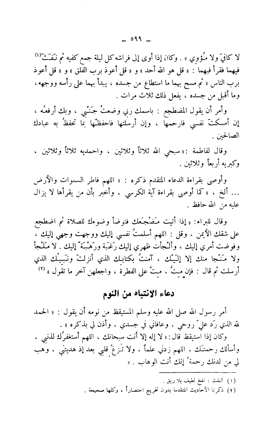 ولا منجا منك إلا إليك، آمنت بكتابك الذي أنزلت ونبيك الذي أرسلت ثم قال: فإن مت، مت على الفطرة، واجعلهن آخر ما تقول " (2) دعاء الانتباه من النوم أمر رسول الله صلى الله عليه وسلم المستيقظ من نومه أن يقول: " الحمد لله الذي رد علي روحي.