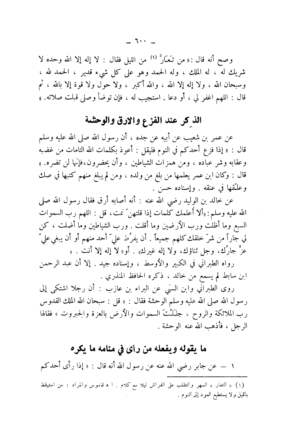 " الذكر عند الفزع والارق والوحشة عن عمر بن شعيب عن أبيه عن جده، أن رسول الله صلى الله عليه وسلم قال: " إذا فزع أحدكم في النوم فليقل: أعوذ بكلمات الله التامات من غضبه وعقابه وشر عباده، ومن همزات الشياطين، وأن يحضرون، فإنها لن تضره.