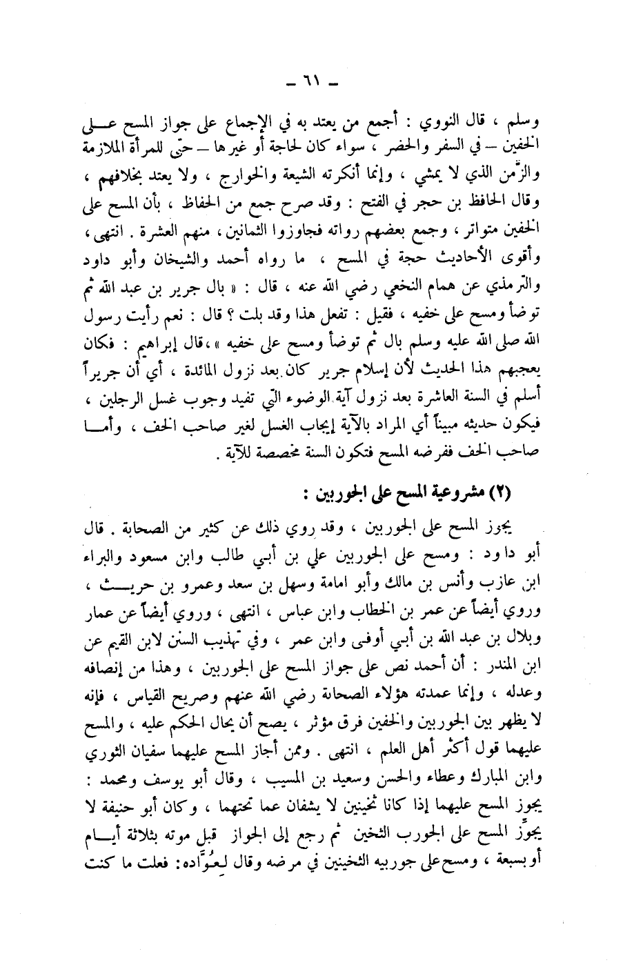 وسلم، قال النووي: أجمع من يعتد به في الاجماع على جواز المسح على الخفين - في السفر والحضر، سواء كان لحاجة أو غيرها - حتى للمرأة الملازمة والزمن الذي لا يمشي، وإنما أنكرته الشيعة والخوارج، ولا يعتد بخلافهم، وقال الحافظ بن حجر في الفتح: وقد صرح جمع من الحفاظ، بأن المسح على الخفين متواتر، وجمع بعضهم رواته فجاوزوا الثمانين، منهم العشرة.