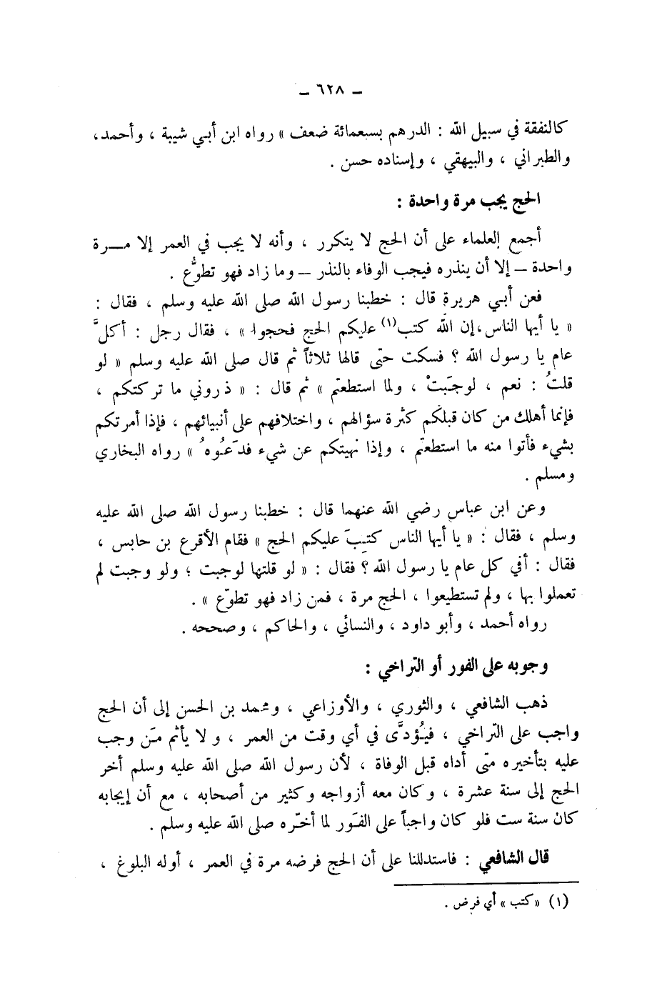 وعن ابن عباس رضي الله عنهما قال: خطبنا رسول الله صلى الله عليه وسلم، فقال: " يا أيها الناس كتب عليكم الحج " فقام الاقرع بن حابس، فقال: أفي كل عام يا رسول الله " فقال: " لو قلتها لوجبت، ولو وجبت لم تعملوا بها، ولم تستطيعوا، الحج مرة، فمن زاد فهو تطوع ".