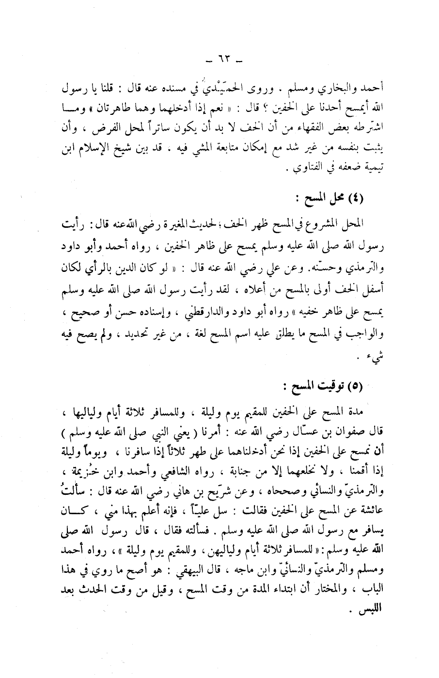 (5) توقيت المسح: مدة المسح على الخفين للمقيم يوم وليلة، وللمسافر ثلاثة أيام ولياليها، قال صفوان بن عسال رضي الله عنه: أمرنا (يعني النبي صلى الله عليه وسلم) أن نمسح على الخفين إذا نحن أدخلناهما على طهر ثلاثا إذا سافرنا، ويوما وليلة إذا أقمنا، ولا نخلعهما إلا من جنابة، رواه الشافعي وأحمد وابن خزيمة،