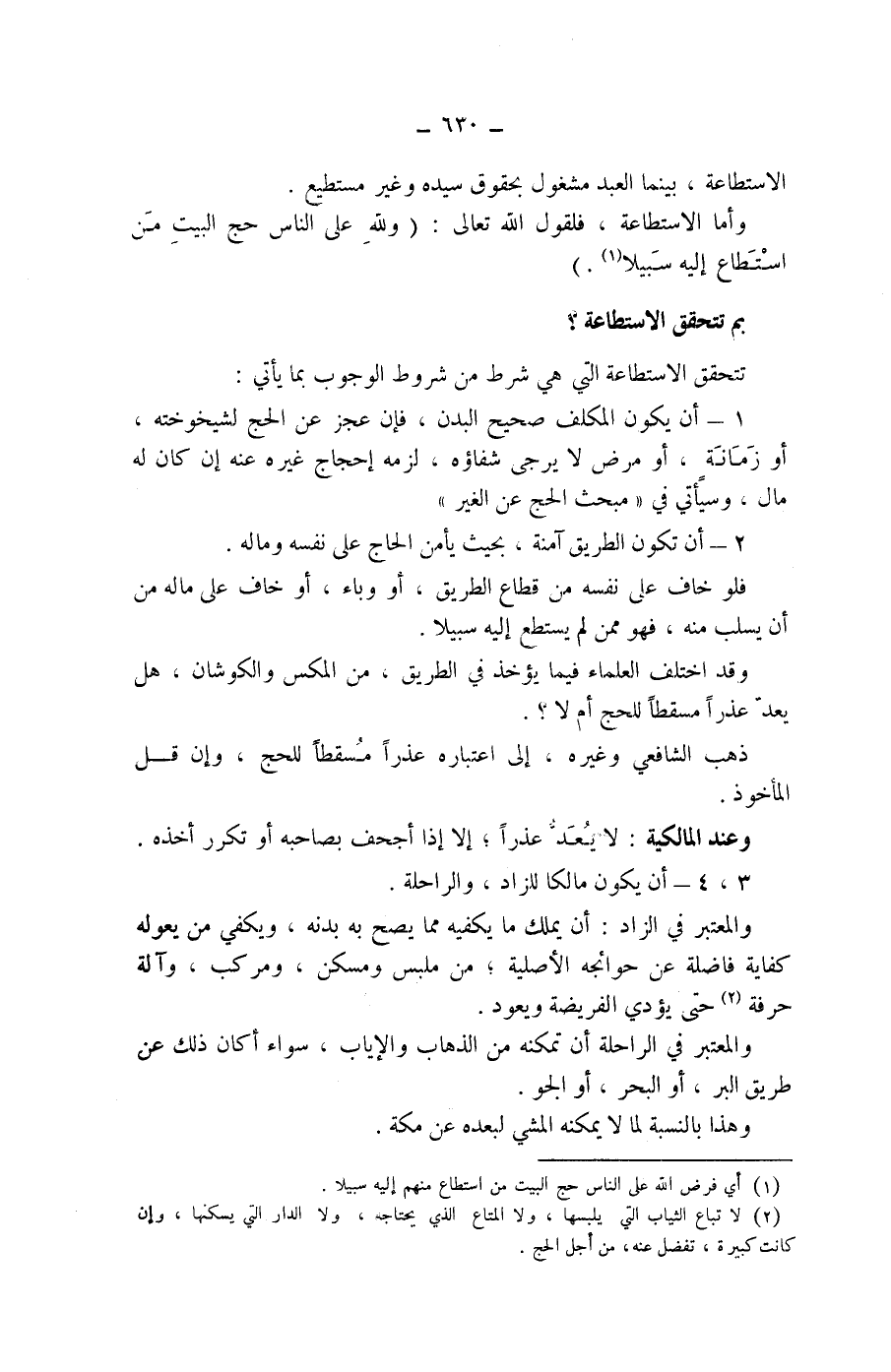 ) بم تتحقق الاستطاعة؟ تتحقق الاستطاعة التي هي شرط من شروط الوجوب بما يأتي: 1 - أن يكون المكلف صحيح البدن، فإن عجز عن الحج لشيخوخته، أو زمانة، أو مرض لا يرجى شفاؤه، لزمه إحجاج غيره عنه إن كان له مال، وسيأتي في " مبحث الحج عن الغير " 2 - أن تكون الطريق آمنة، بحيث يأمن الحاج على نفسه وماله.