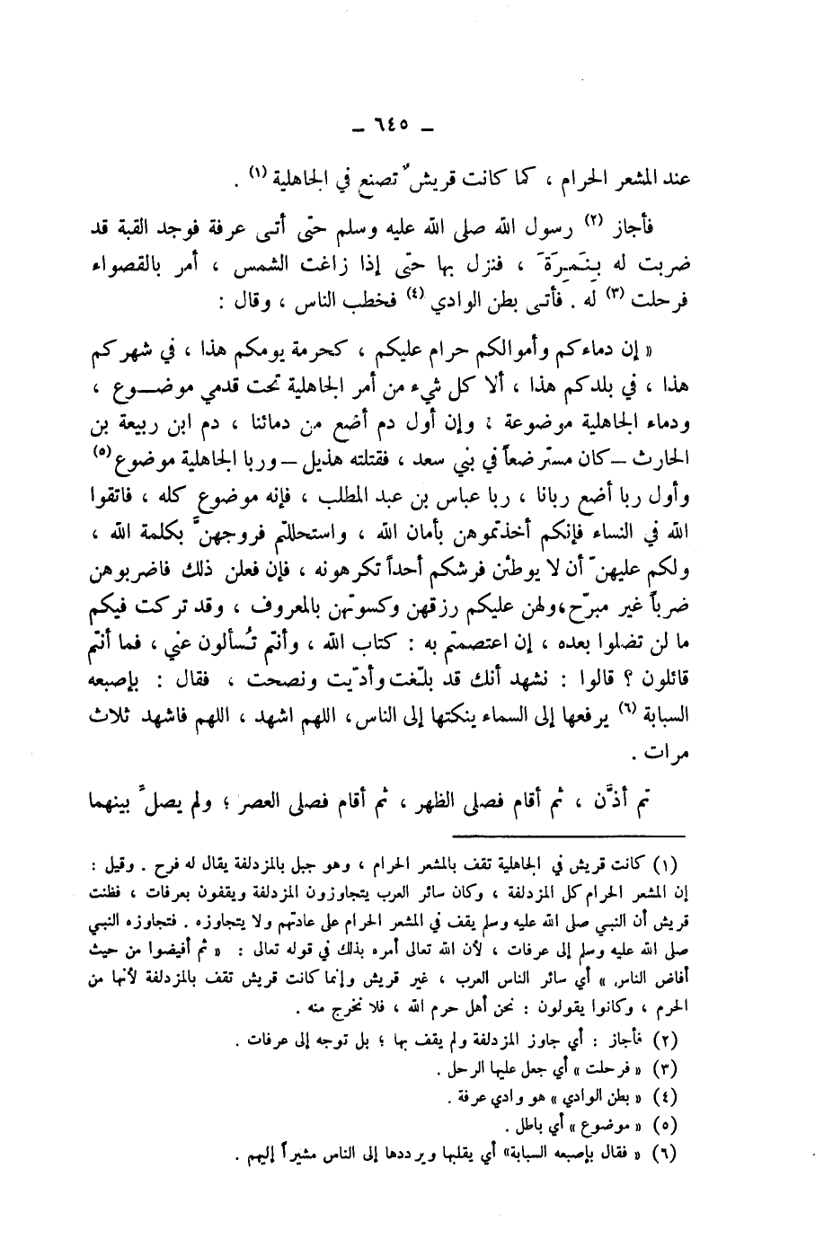 فأتى بطن الوادي (4) فخطب الناس، وقال: " إن دماءكم وأموالكم حرام عليكم، كحرمة يومكم هذا، في شهركم هذا، في بلدكم هذا، ألا كل شئ من أمر الجاهلية تحت قدمي موضوع، ودماء الجاهلية موضوعة، وإن أول دم أضع من دمائنا، دم ابن ربيعة بن الحارث - كان مسترضعا في بني سعد، فقتلته هذيل - وربا الجاهلية موضوع (5) وأول ربا أضع ربانا، ربا عباس بن عبد المطلب، فإنه موضوع كله، فاتقوا الله في النساء فإنكم أخذتموهن بأمان الله، واستحللتم فروجهن بكلمة الله، ولكم عليهن أن لا يوطئن فرشكم أحدا تكرهونه، فإن فعلن ذلك فاضربوهن ضربا غير مبرح، ولهن عليكم رزقهن وكسوتهن بالمعروف، وقد تركت فيكم ما لن تضلوا بعده، إن اعتصمتم به: كتاب الله، وأنتم تسألون عني، فما أنتم قائلون؟ قالوا: نشهد أنك قد بلغت وأديت ونصحت، فقال: بإصبعه السبابة (6) يرفعها إلى السماء ينكتها إلى الناس، اللهم اشهد، اللهم فاشهد ثلاث مرات.