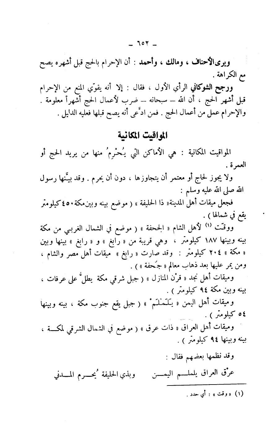 ووقت (1) لاهل الشام " الجحفة " (موضع في الشمال الغربي من مكة بينه وبينها 187 كيلومتر، وهي قريبة من " رابغ " و " رابغ " بينها وبين " مكة " 204 كيلومتر: وقد صارت " رابغ " ميقات أهل مصر والشام، ومن يمر عليها بعد ذهاب معالم " جحفة ") .