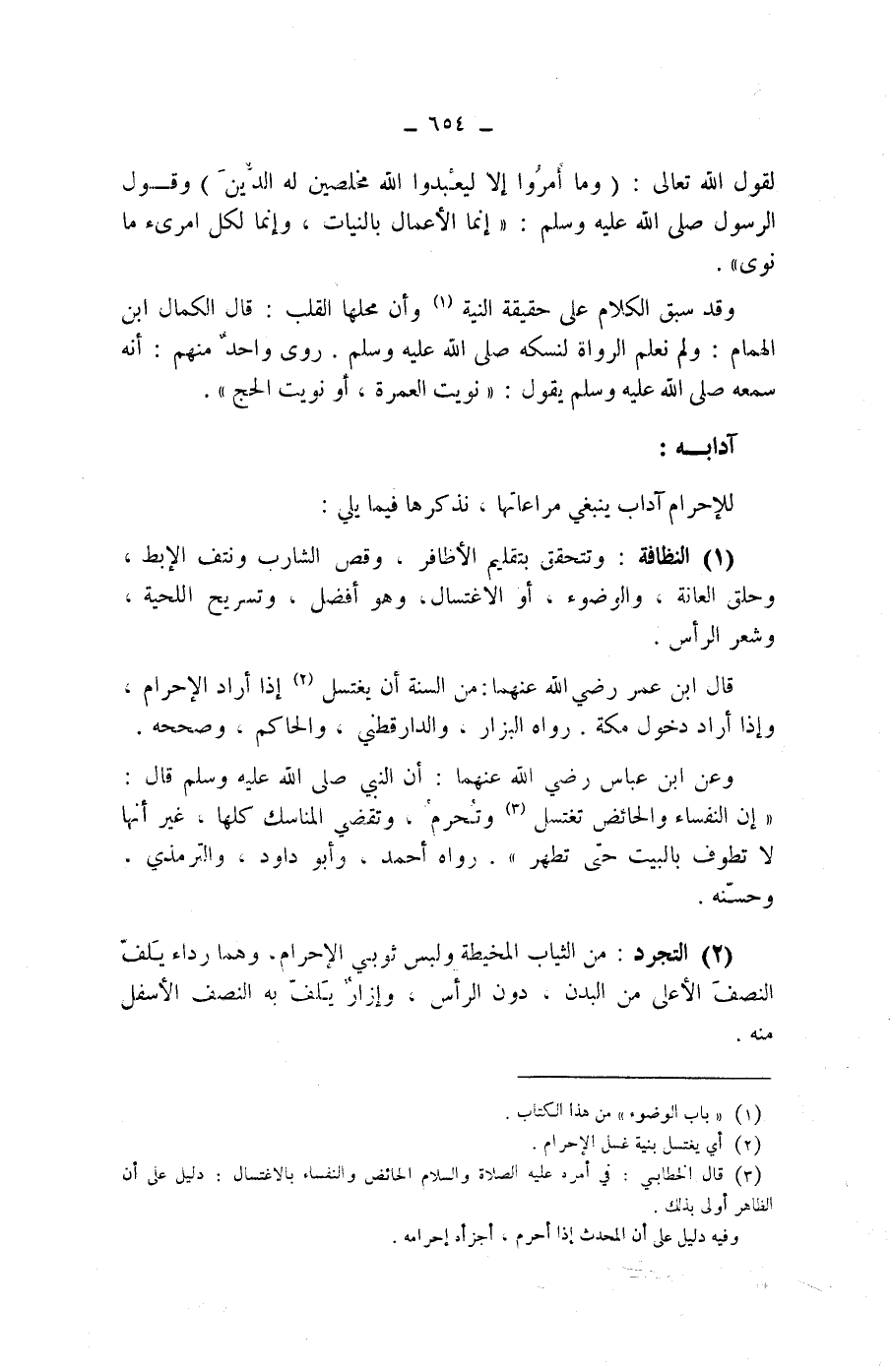 آدابه: للاحرام آداب ينبغي مراعاتها، نذكرها فيما يلي: (1) النظافة: وتتحقق بتقليم الاظافر، وقص الشارب ونتف الابط،