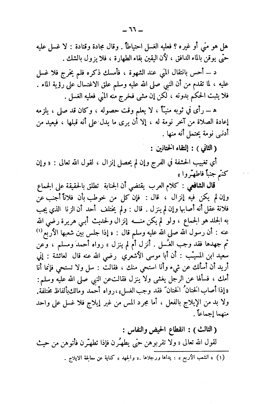 (1) (الشعب الأربع) : يداها ورجلاها، (والجهد) كناية عن معالجة الايلاج.