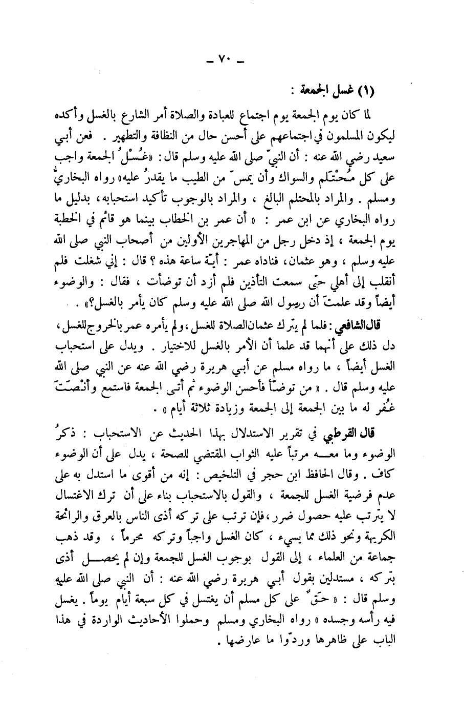 (1) غسل الجمعة: لما كان يوم الجمعة يوم اجتماع للعبادة والصلاة أمر الشارع بالغسل وأكده ليكون المسلمون في اجتماعهم على أحسن حال من النظافة والتطهير.