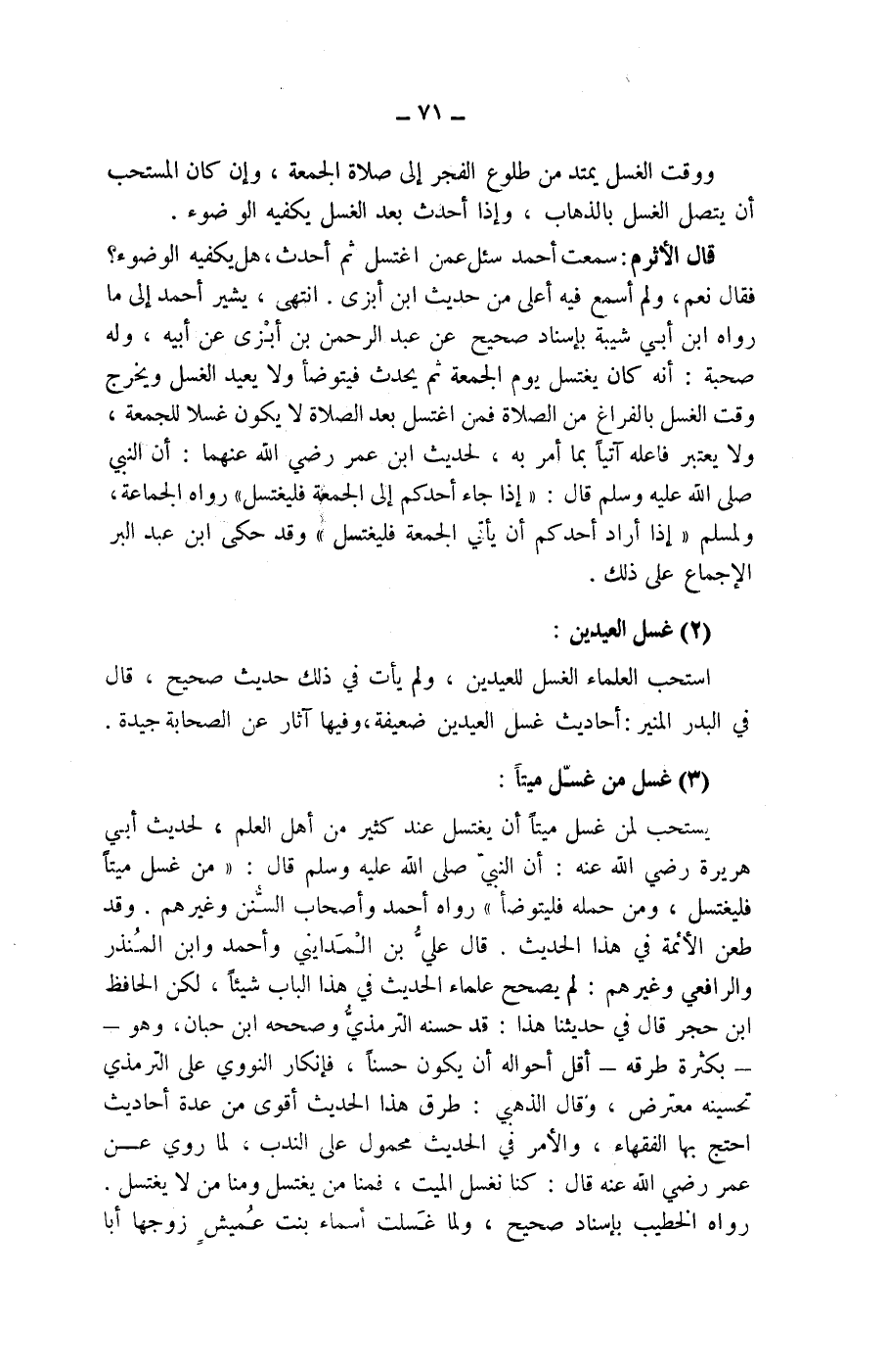 قال علي بن المدايني وأحمد وابن المنذر والرافعي وغيرهم: لم يصحح علماء الحديث في هذا الباب شيئا، لكن الحافظ ابن حجر قال في حديثنا هذا: قد حسنه الترمذي وصححه ابن حبان، وهو - بكثرة طرقه - أقل أحواله أن يكون حسنا، فإنكار النووي على الترمذي تحسينه معترض، وقال الذهبي: طرق هذا الحديث أقوى من عدة أحاديث احتج بها الفقهاء، والامر في الحديث محمول على الندب، لما روي عن عمر رضي الله عنه قال: كنا نغسل الميت، فمنا من يغتسل ومنا من لا يغتسل.