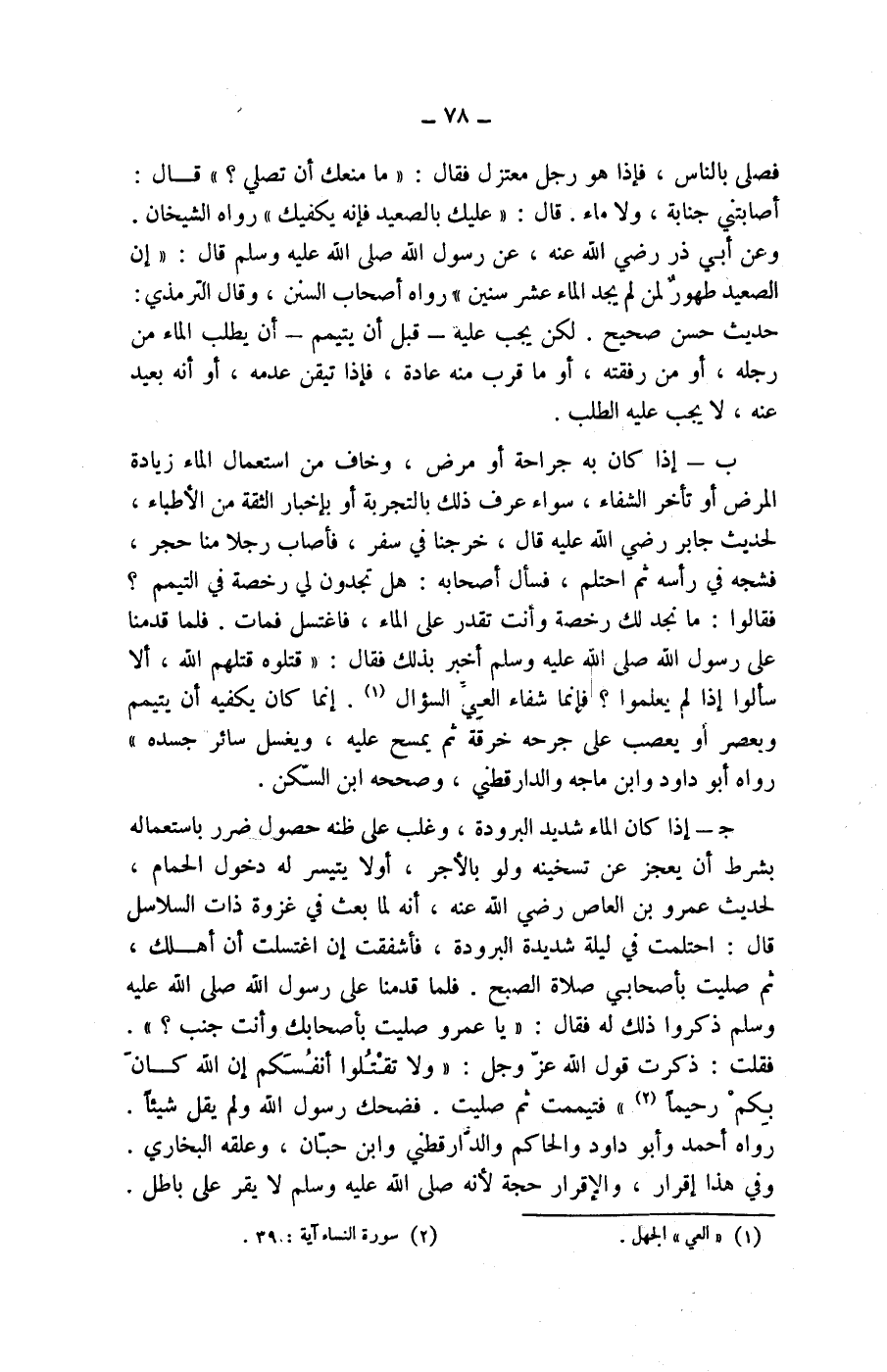 ب - إذا كان به جراحة أو مرض، وخاف من استعمال الماء زيادة المرض أو تأخر الشفاء، سواء عرف ذلك بالتجربة أو بإخبار الثقة من الاطباء، لحديث جابر رضي الله عليه قال، خرجنا في سفر، فأصاب رجلا منا حجر، فشجه في رأسه ثم احتلم، فسأل أصحابه: هل تجدون لي رخصة في التيمم؟ فقالوا: ما نجد لك رخصة وأنت تقدر على الماء، فاغتسل فمات. فلما قدمنا على رسول الله صلى الله عليه وسلم أخبر بذلك فقال: (قتلوه قتلهم الله، ألا سألوا إذا لم يعلموا؟ فإنما شفاء العي السؤال (1) . إنما كان يكفيه أن يتيمم ويعصر أو يعصب على جرحه خرقة ثم يمسح عليه، ويغسل سائر جسده) رواه أبو داود وابن ماجه والدارقطني، وصححه ابن السكن.