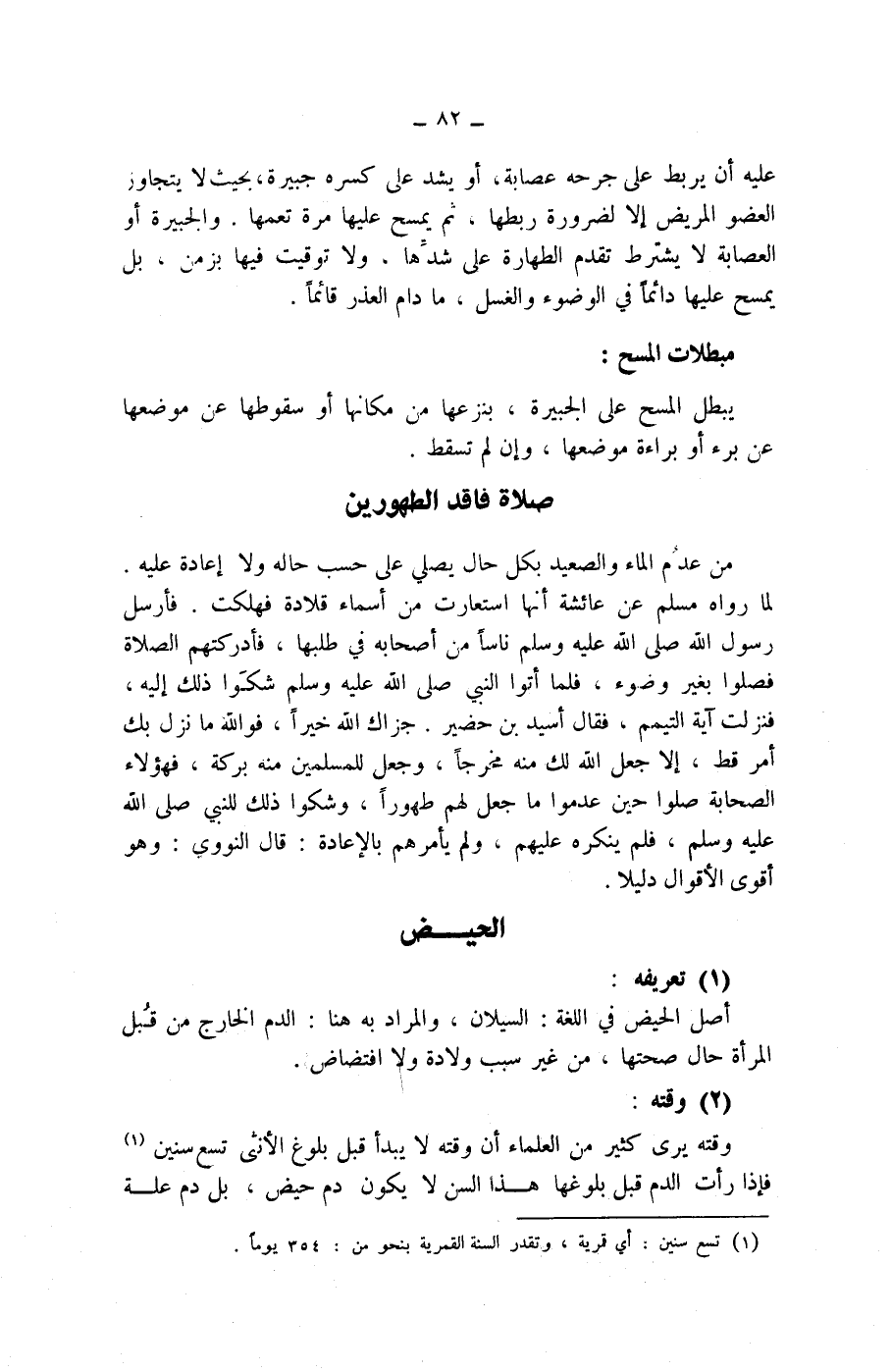 (1) تعريفه: أصل الحيض في اللغة: السيلان، والمراد به هنا: الدم الخارج من قبل المرأة حال صحتها، من غير سبب ولادة ولا افتضاض.