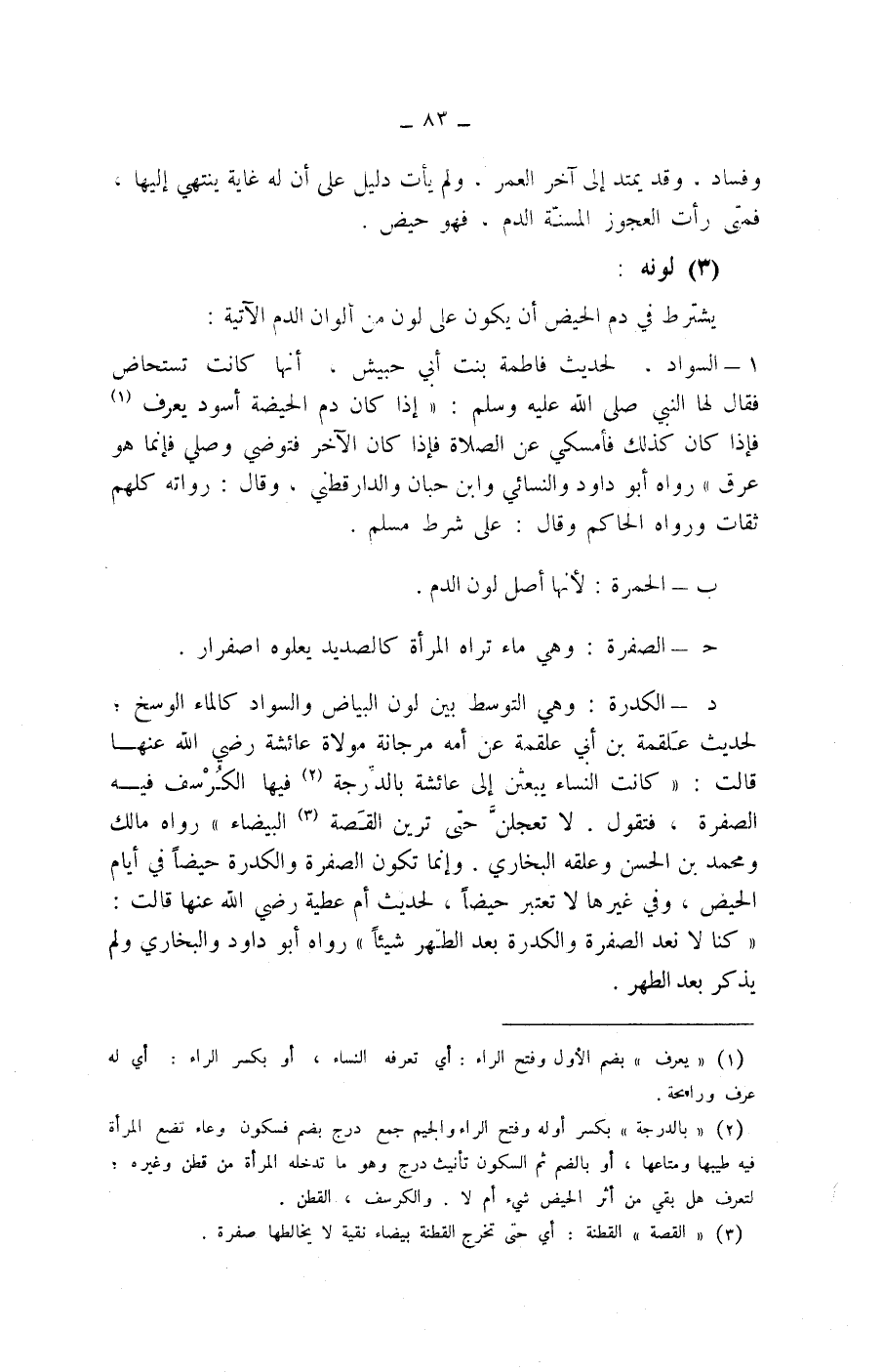 د - الكدرة: وهي التوسط بين لون البياض والسواد كالماء الوسخ، لحديث علقمة بن أبي علقمة عن أمه مرجانة مولاة عائشة رضي الله عنها قالت: (كانت النساء يبعثن إلى عائشة بالدرجة (2) فيها الكرسف فيه الصفرة، فتقول. لا تعجلن حتى ترين القصة (3) البيضاء) رواه مالك ومحمد بن الحسن وعلقه البخاري.