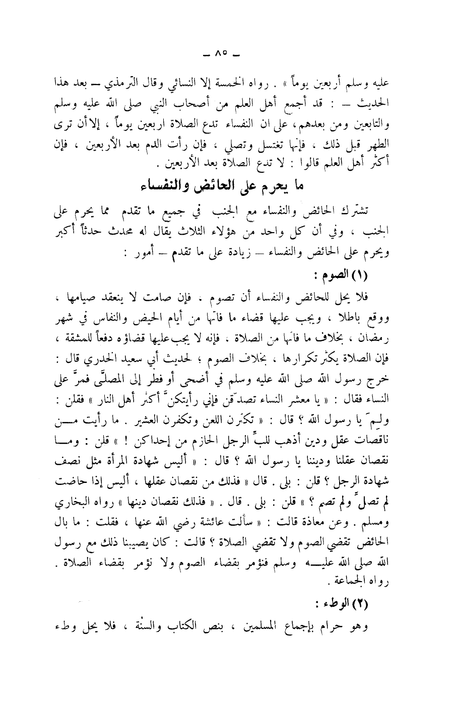 (1) الصوم: فلا يحل للحائض والنفساء أن تصوم، فإن صامت لا ينعقد صيامها، ووقع باطلا، ويجب عليها قضاء ما فاتها من أيام الحيض والنفاس في شهر رمضان، بخلاف ما فاتها من الصلاة، فإنه لا يجب عليها قضاؤه دفعا للمشقة، فإن الصلاة يكثر تكرارها، بخلاف الصوم، لحديث أبي سعيد الخدري قال: خرج رسول الله صلى الله عليه وسلم في أضحى أو فطر إلى المصلى فمر على النساء فقال: (يا معشر النساء تصدقن فإني أيتكن أكثر أهل النار) فقلن: ولم يا رسول الله؟ قال: (تكترن اللعن وتكفرن العشير. ما رأيت من ناقصات عقل ودين أذهب للب الرجل الحازم من إحداكن!) قلن: وما نقصان عقلنا وديننا يا رسول الله؟ قال: (أليس شهادة المرأة مثل نصف شهادة الرجل؟ قلن: بلى. قال (فذلك من نقضان عقلها، أليس إذا حاضت لم تصل ولم تصم؟) قلن: بلى. قال. (فذلك نقصان دينها) رواه البخاري ومسلم.